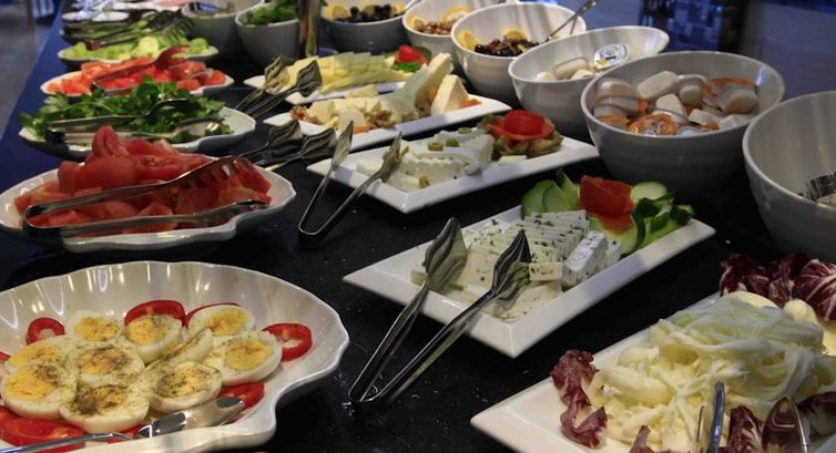 Ресторан находится на крыше отеля с чудесным обзором на море и окрестности. Питание отличное. Море овощей, фруктов, дыни, арбузы, настоящее мясо, курица, индейка, рыба. Приготовлено очень вкусно. Пробовали разные пирожные и тоже понравились, но ими не увлекались. Местное спиртное и пиво тоже входило в наш пакет. Попробовали только вино, красное вино совершенно не понравилось, а белое хорошее. На завтраки были разные хлопья с молоком, каша, выпечка, яйца варёные, сыры, колбасы, овощи и фрукты. Тут же готовили свежий омлет или глазунью. Кофе, чай, соки, как и везде в турецких отелях.
