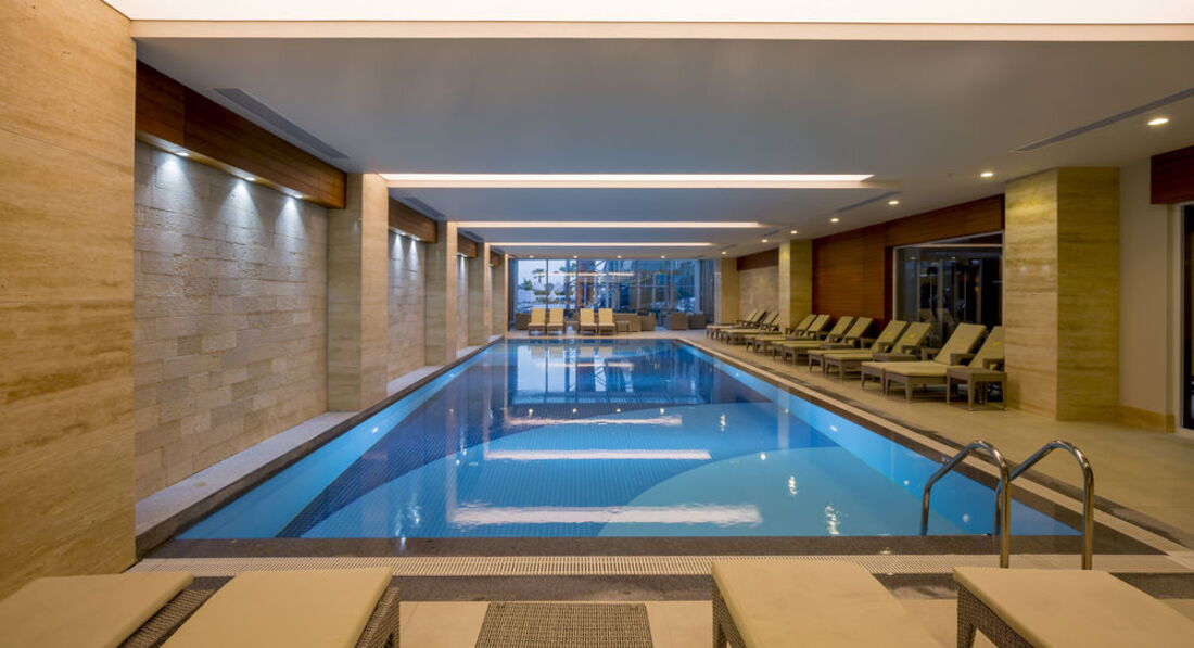 Имеется СПА, сауна, баня, хамам, закрытый бассейн, тренажерный зал, 2 ресторана а-ля карте