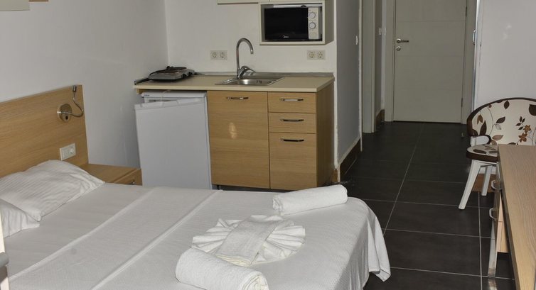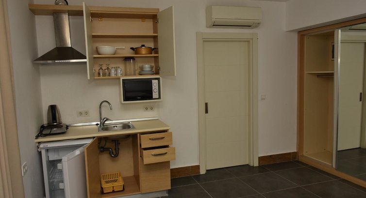 • кухонний куточок (2-х конфоркова електроплита, міні-холодильник, електрочайник, НВЧ, кухонне приладдя та посуд)