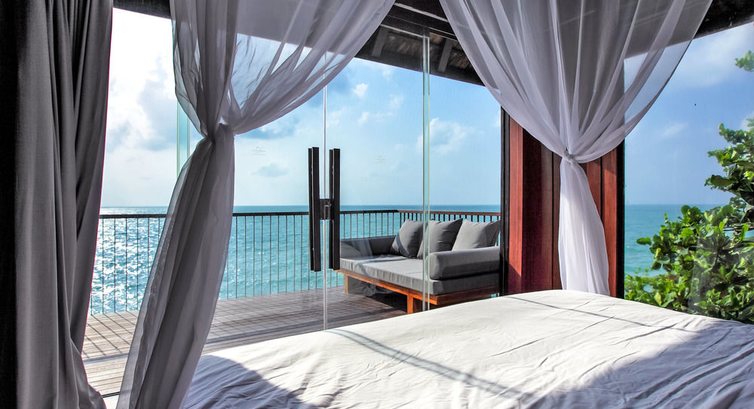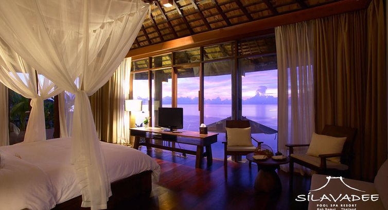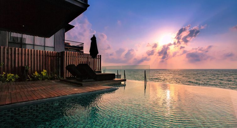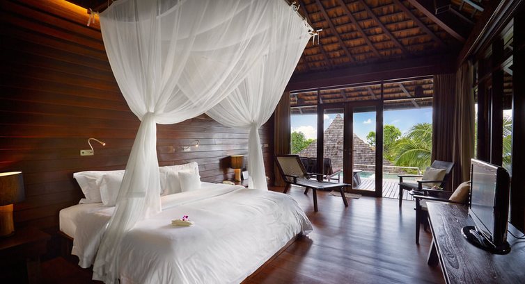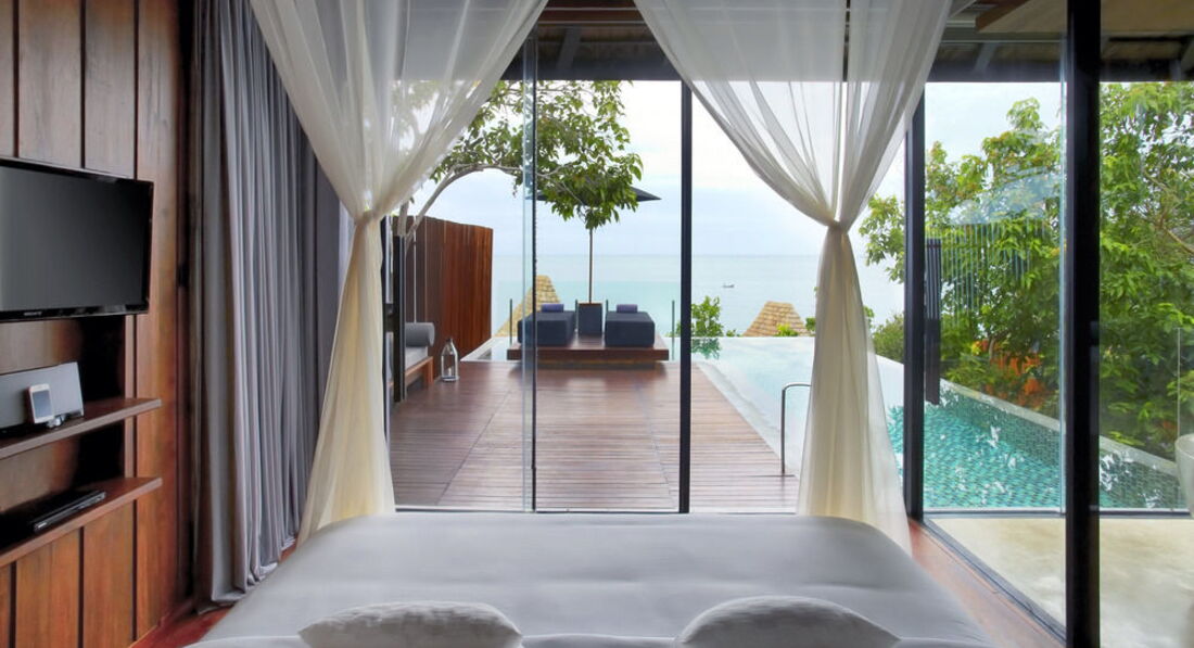 4 Ocean Front Pool Villa Suite (вид на море, спальня, вітальня з двома ванними, басейн з Aqua Jet Massage Bed), тераса з лежаками та обіднім столом, вбиральня, iPod Touch, комп'ютер у номері, макс. 2+1 чол. , Загальна площа ділянки вілли 300 м2).