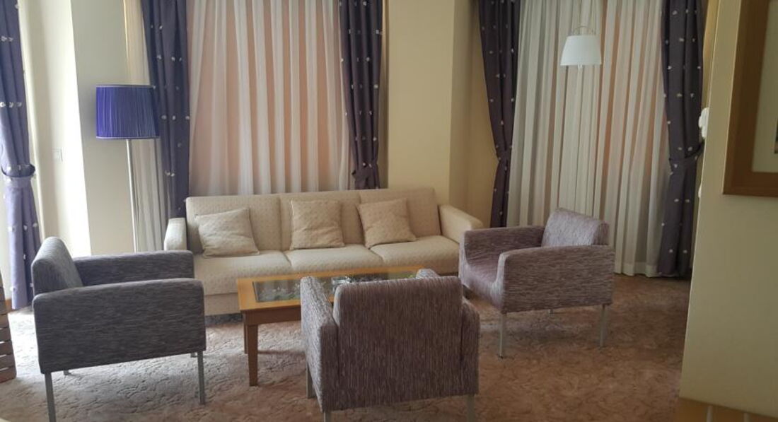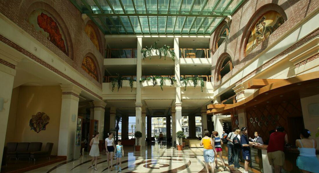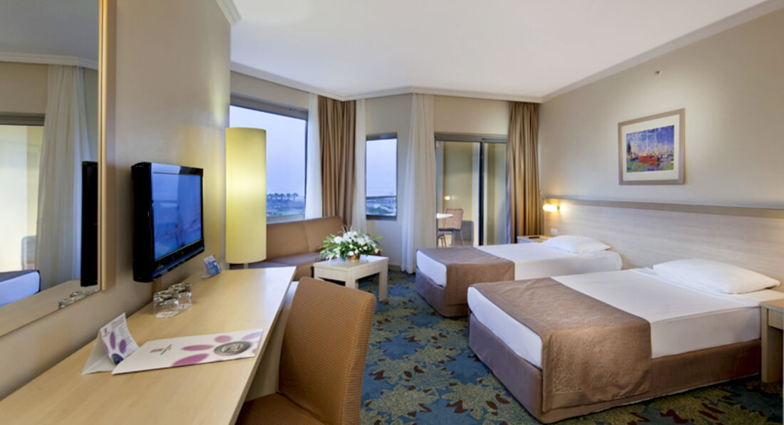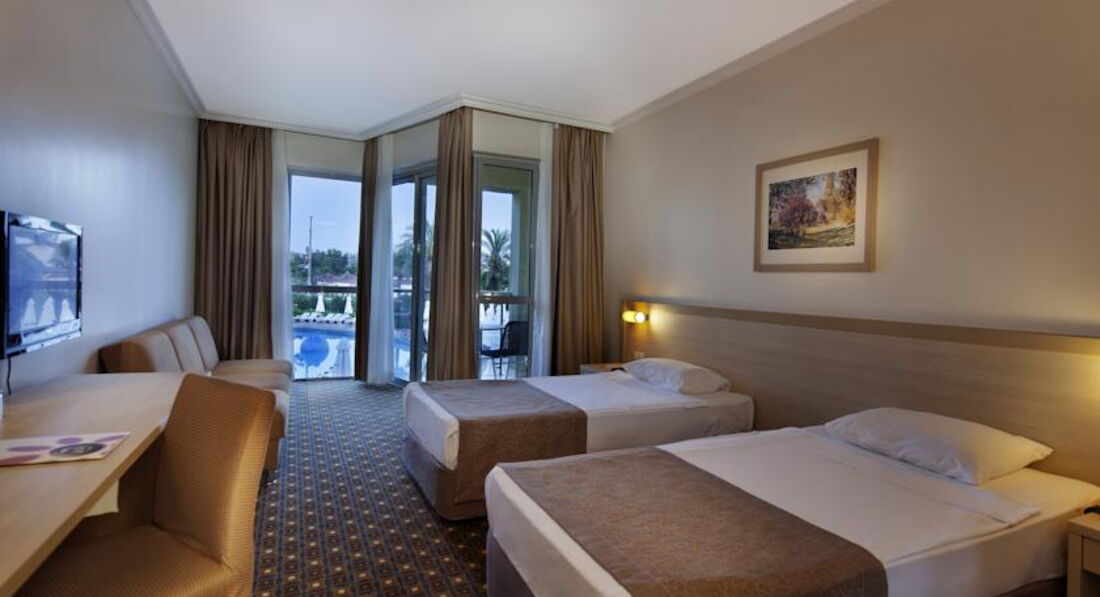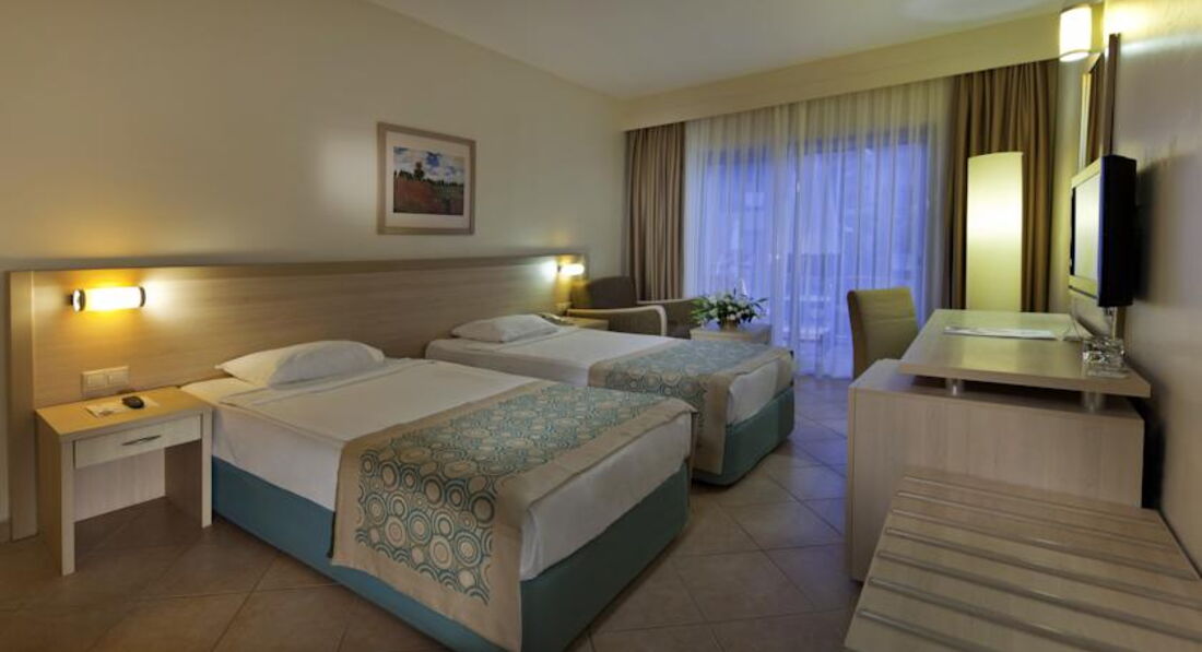 В 2 часа подошли на ресепшен выдали нам ключи от номера, карточки от пляжных полотенец, 5 билетов в луна-парк, и всякие расписания того, что есть в отеле. Подняли наш чемодан. Комната у нас была 4068. Что есть в номере? В ванной: туалет, ванна, мыло и шампунь фирмы DOVE, одноразовые шапочки для душа, ватные диски для снятия макияжа, пакетики для утилизации мусора, полотенца белые, фен работающий, мусорка и большое зеркало. В комнате две кровати раздвинутые( мы их сдвинули), две тумбочки с бра, кресло раздвижное, диван раздвижной, стол, телевизор (каналы из русских стс, тнт, первый, нтв больше не помню), мини бар( литровые спрайт, кола, фанта, вода простая. две бутылки 0,5 содовой два пива 0,33 Efes), бесплатное пополнение мини-бара,два стеклянных стаканчикка сейф бесплатный, кондиционер работающий, дополнительные подушки и одеяла, вешалки в шкафу, две пепельницы. Вроде все. Пол-ковролин. Нас все устраивало, за номер ставлю 5. Балкон два сидения и стол. Сушилки нет. Все вешали прям на перила балкона. Один раз поднялся ветер несколько вещей снесно. Подняли. У некоторых вещи попадали на крышу крытого бассейна. Так и остались лежать. Потом привязывали вещи. Вид с балкона - не на что, на какой-то другой отель. Но мы не стали менять и доплачивать за вид из окна. Уборка. Мы не придирались, мусор убирали пепльницы убирали, полотенца меняли, иногда меняли постельное белье. Было два случая. Первый - прошла уборка, забрали три полотенца для душа оставили два, сходили на ресепшен через час принесли полотенце. Через нескольео дней ситуация повторилась, но теперь еще и не пополнили мини-бар, закончилось все даже простая вода, сначала в обед сходила я на ресепшен, все записали, ждали до 6 вечера никакой реакции. Потом пошел муж. Через час пришла уборщица и менеджер дали плотенце и все. Муж говорит "Пройдемте, посмотрим мини-бар". Прошли, у менеджера глаза на лоб, вся покраснела. Вышли. Через пять минут прибежала уборщица принесла весь мини-бар. Так больше инцидентов не возникало. Особо не смотрели мы как пылесосели, как пыль стирали. Вроде нормально. Уборка 3. Поэтому среднюю оценку ставлю 4. Уборщицы говорят только по турецки. Поэтому сразу на ресепшен или даже лучше на guest-ресепшен. А да, вода из крана хлорированная.