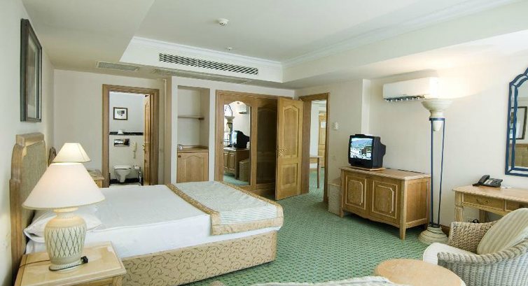 Приехали семьей в сие чудо 22 августа. Отель встретил нас ужасной духотой на респшен. Как выяснилось, у них случилась проблема с электрикой. Приехал я с женой, двумя детьми 6 и 8 лет и тещей. Приехали в 8 утра. Сразу попросили управляющего заселить нас как можно быстрее, за детей переживали. В итоге, нам предложили номер только в 14.30 и то, когда мы начали возмущаться по поводу их нерасторопности, на что нам ответили, что у уборщиц отеля тоже есть обед и мы должны ждать! В течении ожидания, мы познакомились с несколькими семьями из России, которых заселили не в те номера, за которые они заплатили, само собой в худшии. Одну семью из пяти взрослых людей ( в том числе взрослых дочерей) поселили в номер с одной двуспальной кроватью и одной детской кроватью. Другую семью состоящей из одной пожилой женщиной (мамы) и ее сына 40 примерно лет, поселили в номер с общей кроватью. Третья семья ругалась при нас на ресепшен с помощницей управляющего Юлей, которая хоть и выглядит невинно, но является вторым человеком после управляющего отеля. В общем нам тоже предложилии номер площадью 25-30 кв.м. с одной двуспальной и одной односпальной кроватью, одним телевизором и без балкона. На наше возмущение, нам сказали, что в связи с праздником Курбан Байрам, мест в отеле нет. И если нам что-то не нравится, мы можем валить отседава в другой отель (не ясно только какой). В общем наш номер был продан какой то турецкой семье.И это при том, что номер который я оплатил, должен был быть самым лучшим в этом отеле (Сюит ... не помню как полностью называется). Кстати, чтобы наши чемоданы довезли до номера, мы еще минут 15 ждали и даже возмущались, на что наши турецкие друзья вообще никак не реагировали. В итоге уборщица (из Киргизии) нам очень посочувствовала и показала освободившийся номер пососедству. Благо тот был просторный, хоть и без балкона. В него мы вцепились зубами. Когда пришел наш гид, мы расказали об этом беспределе, на что управляющий нагло солгал, что хотел нам его предложить. На третьи сутки мы случайно столкнулись с директором отеля, который нихрена не понимал по Русски. Через переводчика мы объяснили что да как, на что он улыбнулся и сказал что ничем помочь не может. Через день, когда наконец то закончилось время проживания какой то турецкой задницы в нашем номере, нам предоставили его в наше распоряжение. В знак своего недовольства, мы через гида попросили компенсацию морального вреда в виде бесплатного похода на теннисный корт на остаток отдыха (три дня). Стоил он 10 долларов в час. Гид еле уговорил их. Да, и еще о турках: в отеле их было процентов 80. Народ этот довольно наглый. Русских они не любят. С одним даже чуть в столовой (рестораном - язык не поворачивается назвать) не подрался (занял наше забронированное место и не ушел в итоге). Еда не лучшего качества. За вкусным мясом простоите час в очереди. Остальная еда острая или не понятная лично для меня. Море было чистое два дня, потом к берегу прибило какой то мусор в виде пластиковых стаканчиков и этикеток от бутылок. Туркам было пофиг, а я стал заходить с пирса, там было чище. Отель убирается редко, на стеклах, в лифте и дверях следы рук и какой то слизи (пота наверное). В общем друзья, в этот отель с явным русофобским настроем я ехать никому не советую. Не вставайте на наши грабли.