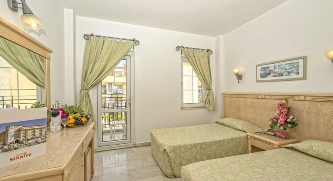 Вернулись из отеля в августе 2018..В Турции были впервые и отель выбирали очень долго,читали отзывы,сравнивали,остановились на Синатре,и нисколько не пожалели...Приехали в отель в девять утра,сходили на завтрак,нам предоставили помещение где можно было переодеться,оставить свои вещи,и пошли на море..В номер нас заселили в двенадцать,номер маленький и очень уютный,с видом на горы...В номере две кровати,телевизор плазма с российскими каналами,телефон,кондиционер,который работал исправно,санузел совмещен,маленькая душевая кабина,но все помещались,перебоев с горячей водой не было,сейф-которым мы не пользовались,холодильник в котором находятся напитки-пиво,воды,соки-всё что в холодильнике-платное...Кормили в отеле отлично,каждый день мясо,фрукты,овощи,несколько раз готовили рыбу на гриле...Уборка в номерах каждый день,меняли постельное белье,и полотенца ...Персонал очень приветливый и дружелюбный...Пляж-галька,лучше брать с собой тапочки,очень тяжело ходить..Лежаков всегда хватало,на пляже работает сотрудник который всегда поможет...В этот отель хочется возвращаться..Рекомендую!