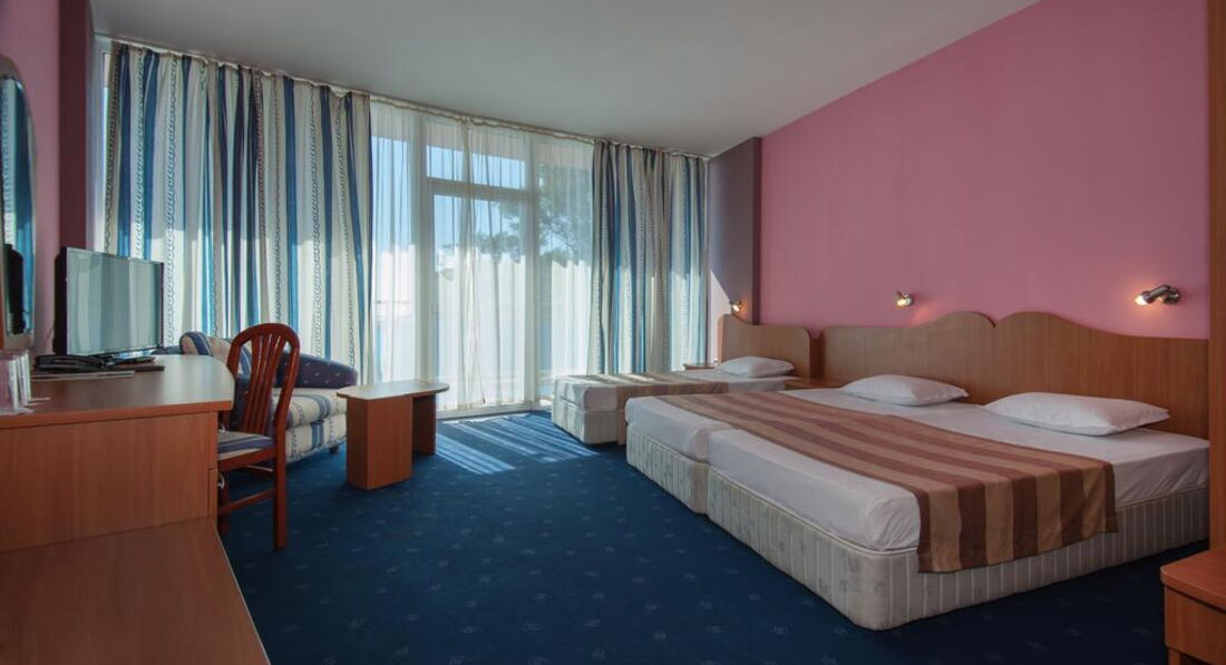 В данный момент с супругой находимся в данном отеле. Перед поездкой просчитали отзывы с сайта ( в основном негативные) но все равно решили поехать, тем более что цена была очень даже привлекательная ( отдали 29 тысяч за 11 ночей на все включено). Ну вообщем все отзывы прошлогодние и не очень хорошие, но в этом году видимо все изменилось. Заселили в номер 509 это на пятом этаже прямо по середине комплекса с самым что не есть прямым видом на море. В номере чисто и все работает. Есть телевизор, сейф ( в описании пишут что платный но он работает и никто за него денег не просил) есть бесплатный вайфай пароль к которому можно получить на рецепции. Убираются каждый день, полотенца меняют по требованию( надо кидать на пол, о чем на стене инструкции правда на болгарском).