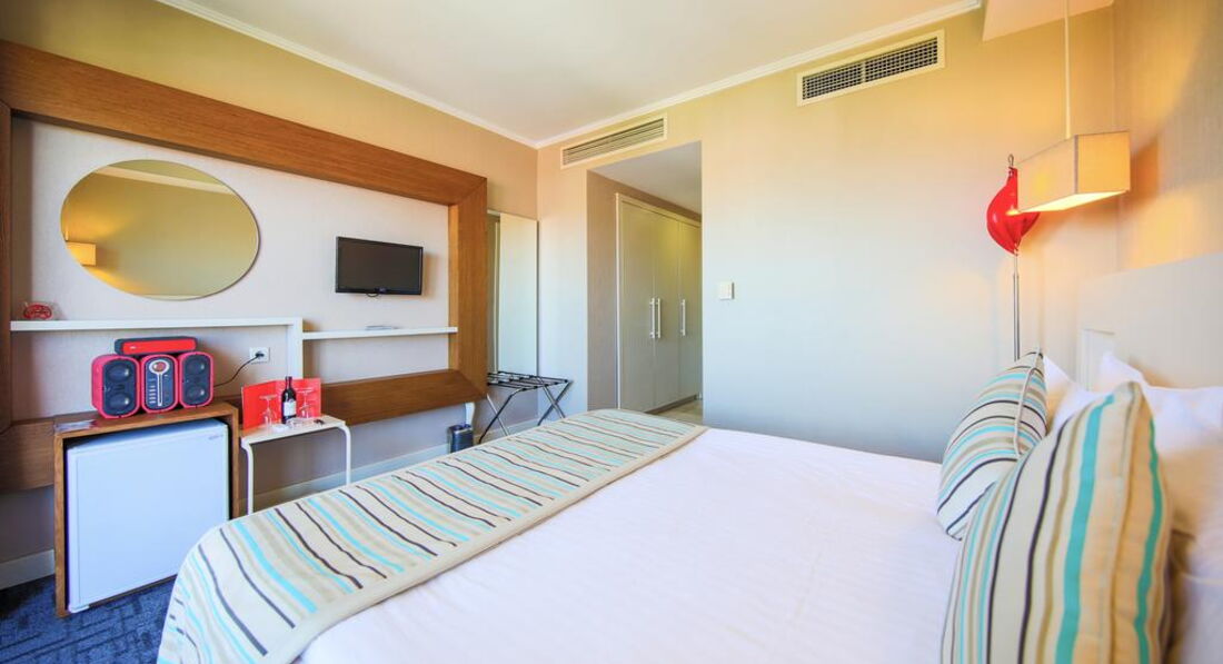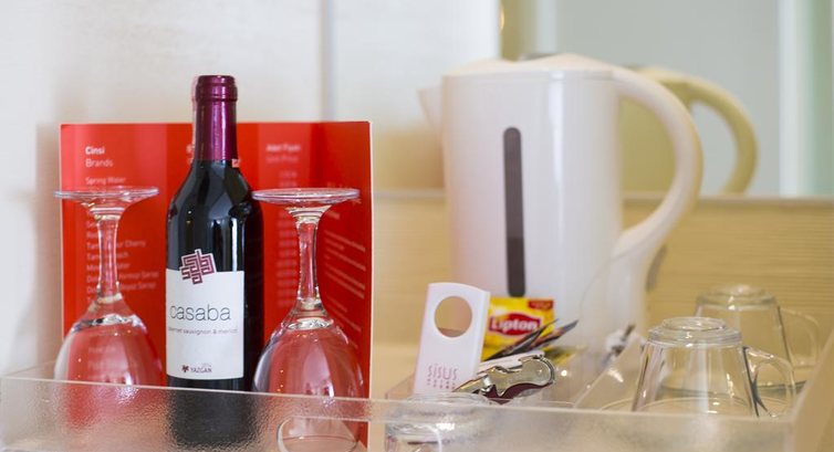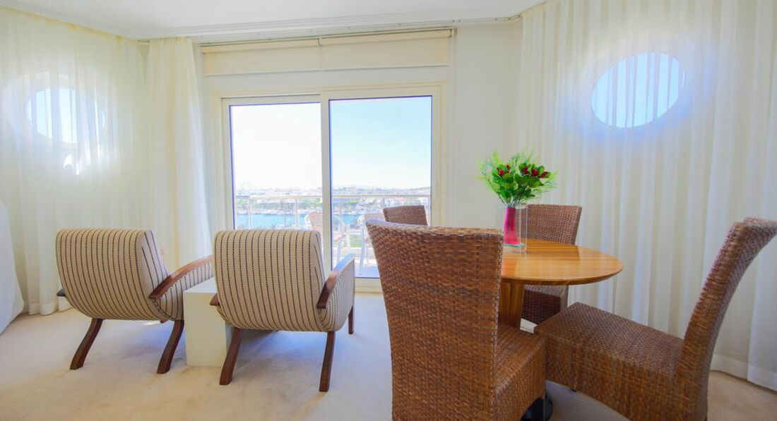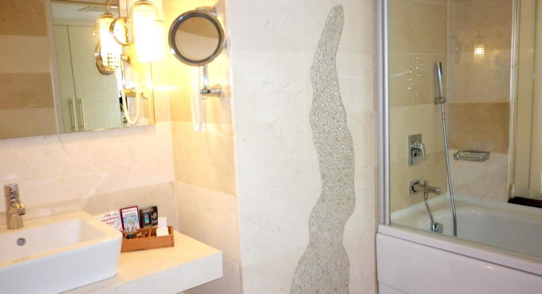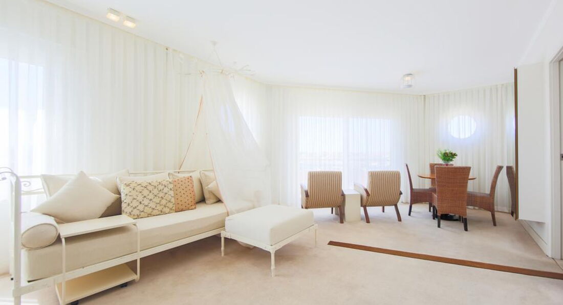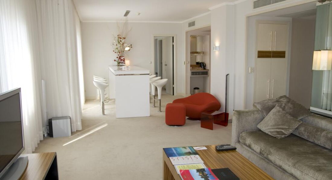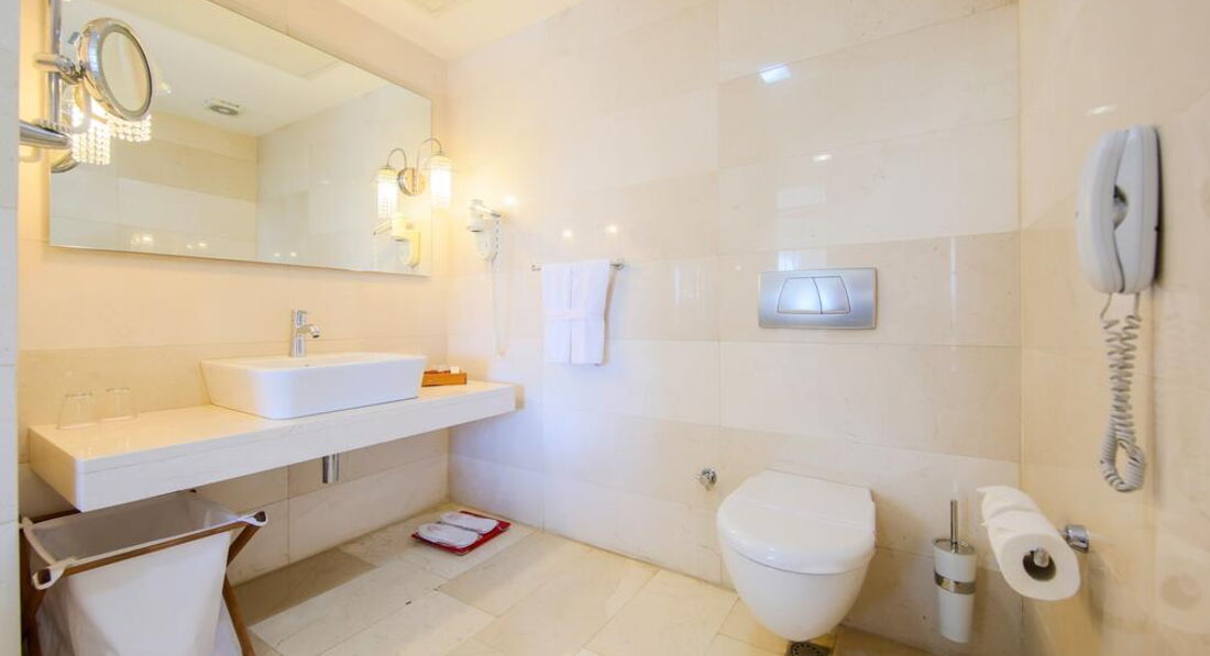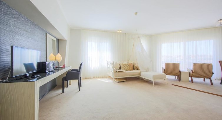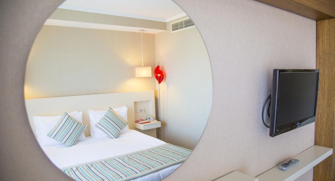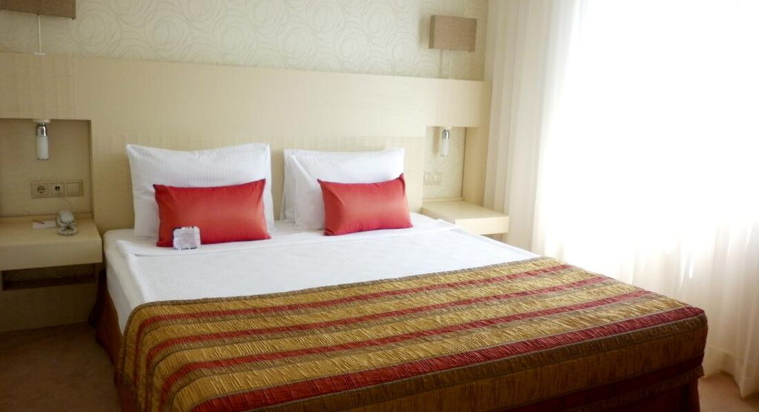 Типи номерів: • 21 economy room (без балкона, з них 1 номер для інвалідів; макс. 2 особи, 20 м2); • 12 двокімнатних junior suite (вітальня, спальня з дверима, макс. 3+1 чол., 35 м2); • 20 standart room (макс. 3 чол., 25 м2); • 10 двокімнатних corner & front suite (з видом на море, вітальня, спальня з дверима, ванна кімната з джакузі, макс. 3+2 чол., 45-55 м2); • 1 дворівневий King suite (на першому рівні: вітальня, 2 спальні з дверима, 2 ванні; на другому рівні: вітальня, тераса з джакузі, макс. 6 чол., 180 м2).У номері: • електричний чайник (набір чаю та кави, платно) • сейф: у номері, безкоштовно • зміна білизни: 3 рази на тиждень • кондиціонер: центральний • телефон • підлога: килимове покриття • прибирання номера: щоденно • капці • фен: є • міні-бар платно • балкон • ваги • Інтернет: Wi-Fi, безкоштовно • халат • ванна або душ • телевізор: є (російський канал)