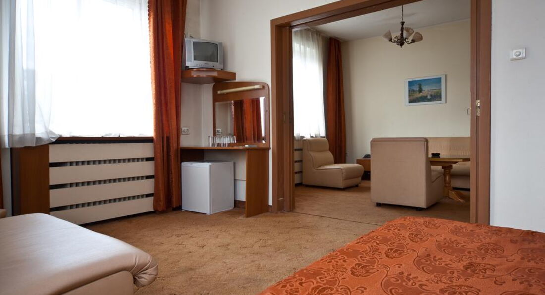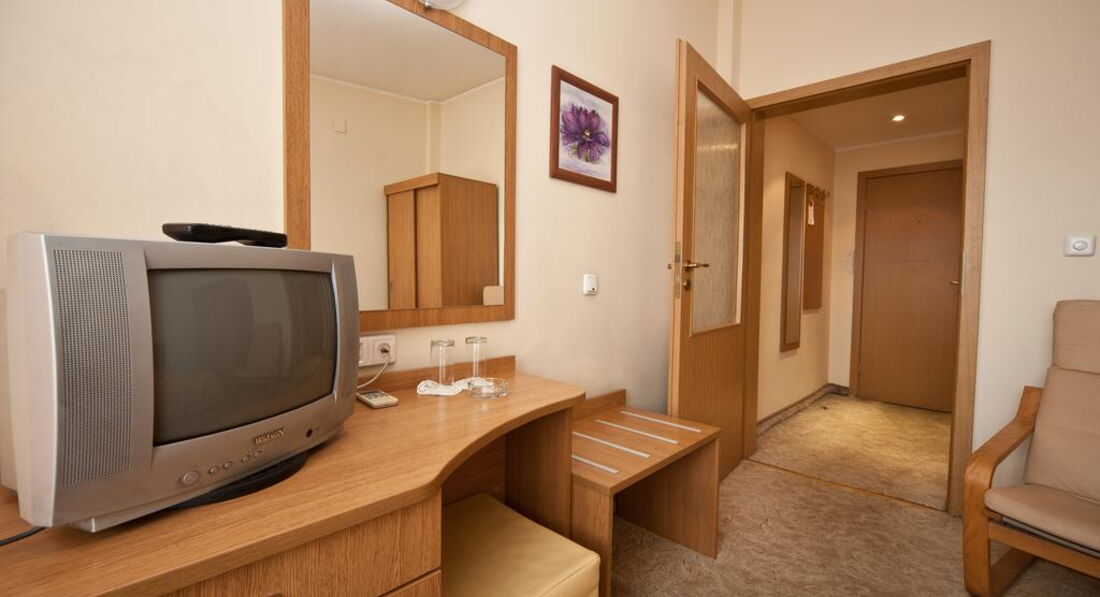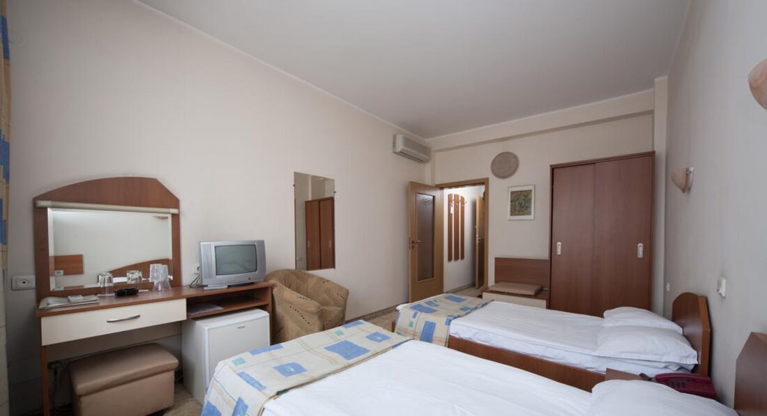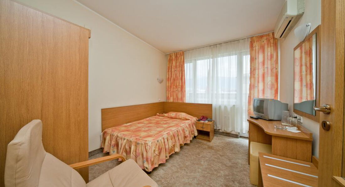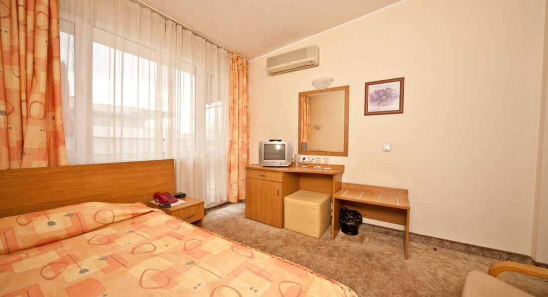 Теперь о самом отеле. Поселился я в номере 204. Конечно, после грандиозной Gloria атмосфера советского санатория для профсозников "СБ" меня подрасстроила. При заселении смутил тот момент, что вода в душе и раковине нагревается не сразу, а в течение минут пяти, да и Wi-Fi в номерах не тянет, зато он бесплатный и быстрый на рецепции (там вообще очень уютно), хотя пару дней его выбивало, а персонал не спешил решать эту проблему. Но, при этом, в номере было чистенько, ежедневно мне подкладывался шампунь, мыло, менялись полотенца и туалетная бумага. Раз в несколько дней менялась постель. Особенно порадовало нахождение в номере мини-бара, который я использовал, как холодильник и обилие розеток в очень удобных местах. Порадовало и обилие полезных ниш для вещей. В целом, не огорчила и шумоизоляции - с улицы я ничего не слышал. НО с пятницы по воскресенье по ночам в здании проходит дискотека часов с 23:00 до 05:00. Клубняк "тынц-тынц" отдает аж в подушку. Первую ночь промучился, а дальше уже сам стал участником этой вакханалии и приходил под утро, наплясавшись, как мартышка, моментально засыпал. В холодное время года и сырую погоду в отеле холодно, но у меня в номере работал кондиционер, я им прекрасно обогревался. В комплекте есть и телевизор с единственным русским Первым каналом. Рекомендую болгарское тв - оно интереснее.