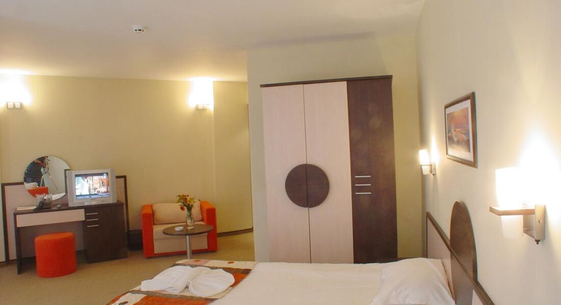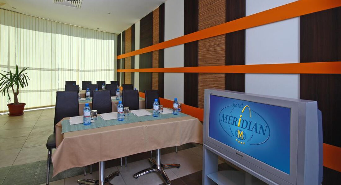 В принципе Меридиан очень даже не плохой, современный, комфортабельный отель, соответствующий своим 4*, вежливое отношение персонала... но по приезде в отель нас отказались заселить и предложили 1 день пожить в отеле Янтра 3*(и это у них не единичный случай, в тот день все, кто с нами заселялся вначале перемещали в Янтру, так что это у них, видимо, в порядке вещей), но, компенсировав это aii inclusev вместо заказанного полупансиона, на следующий день мы все-таки заселились, номер просторный, удобный, с большим балконом, тв с приемом 3 каналов на русском языке, ванная комната просторная с душевой кабиной, феном(мыло есть жидкое, а вот шампуня не оказалось, мы конечно взяли свой, но все же)...