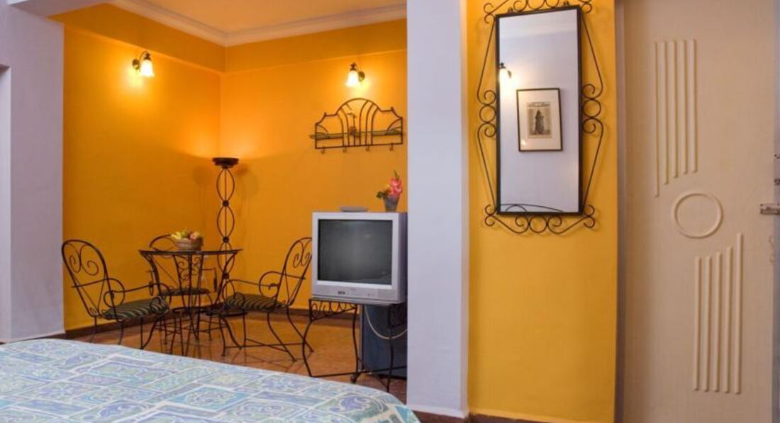 Номер и отель оказался нормальным по меркам ГОА, (Номер состоял из спальни и гостиной:спальня-вентилятор потолочный, 2 кровати, зеркало, шкаф, подставка под чемоданы, прикроватный столик, кондиционер,гостиная: вентилятор потолочный, тахта, 2 кресла, телевизор, журнальный столик, Кухня: раковина, холодильник,мини-бар, стол, 2 стула, Ванна: Раковина, душ, унитаз, нагреватель гор.воды-всё работало,зеркало. 2 балкона на две стороны-закрываются из нутри на щеколду с душками под дополнительный замок,так же и все окна защищены от проникновения из вне.На двери в номер есть дополнительная щеколда с душками под небольшой навесной замок,так что привезённые из дома замки пригодились,так как мы не арендовали сейф на ресепшене,не захотели платить 100 рупасов в сутки за пародию на сейф. Ключи от номера не сдавали,соответственно к нам с уборкой и не попадали, номером остались довольны,дихлофос НЕ пригодился,а раптор-ДА)