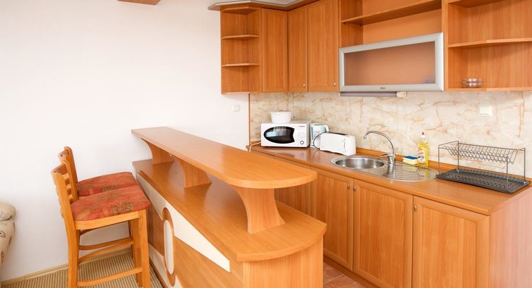 • кухонний куточок: мікрохвильова піч, холодильник, електрочайник, тостер, посуд, прилади (у номерах Apartment)