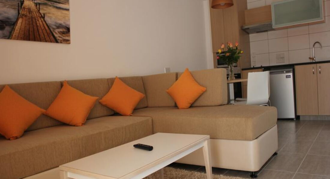 На ресепшене есть русскоговорящий персонал. Кто не говорит по-английски, проблем не будет. В номерах есть кухня. Я брала тур без питания, поэтому это очень удобно. Буквально в десяти минутах от отеля (если идти в сторону моря первый поворот перед набережной направо) есть огромный супермаркет, где продается абсолютно все. Можно закупиться продуктами (холодильник есть) и готовить в номере – благо кастрюли, сковородки и прочая посуда – все имеется.