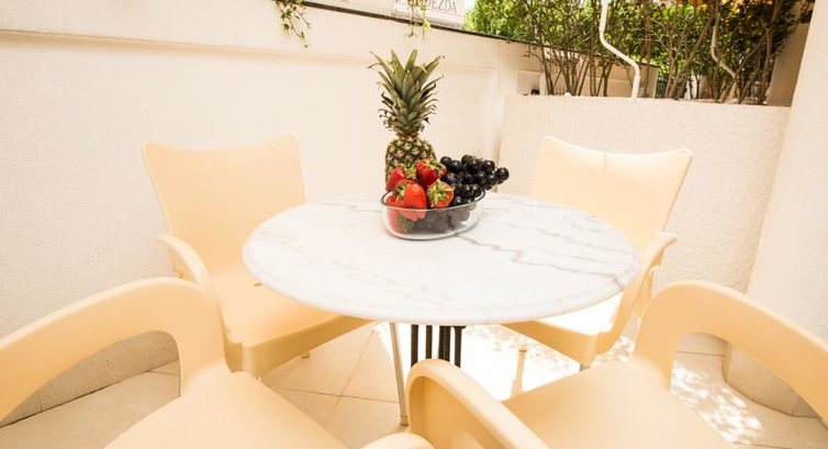 APP 04: Апартамент складається з вітальні, поєднаної з кухнею, спальні, санвузла та тераси. У вітальні: диван, розкладне крісло, кондиціонер, телевізор (кабельне ТБ), кухня (електроплита, мийка, холодильник), фен, сейф, телефон, вихід на терасу. У спальні: двоспальне ліжко (або 2 односпальні), вихід на терасу. Санвузол: туалет та душ. Всього 4 апартаменти подібного типу: 1 з видом на море та 3 апартаменти з видом на двір.