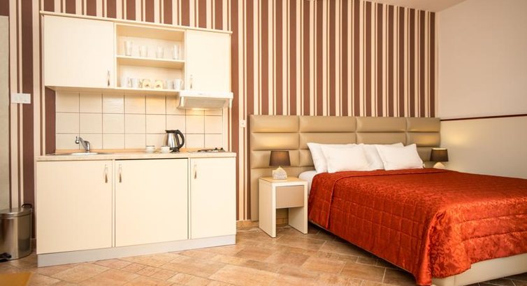 STUD 04: Кімната, поєднана з кухнею, санвузол та тераса. Двоспальне та односпальне ліжка, крісло, що розкладається, кондиціонер, телевізор (кабельне ТБ), кухня (електроплита, мийка, холодильник), фен, сейф, телефон, вихід на терасу. Санвузол: туалет та душ. Усього 3 апартаменти подібного типу: з видом на море, гори та двір.