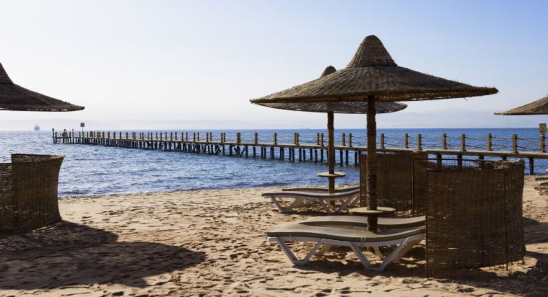 Пляж. Большой и чистый. Постоянно собирают мусор. Лежаков много, но немного разломаны. На пляж приводят верблюдов для катания. Постоянно был ветер и висел красный флаг. Иногда его меняли на желтый. Солнце садится за гору около 17.00