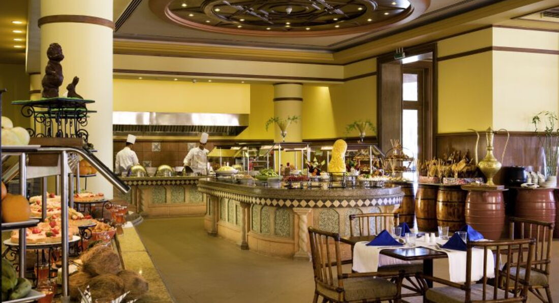 Питание на четверку. Без изысков, но поесть сытно можно было всегда. Употребляли гарниры, нарезанные овощи, курицу или говядину. Проблем с желудком не было никаких. Завтраки тоже понравились, на любой вкус. Из фруктов были бананы, груши, гуава, финики, дыня чем-то залитая. Сладостей очень много. Также можно было поесть в баре у бассейна фаст-фуд: пиццу, бургеры, картошку фри, шаурму. Да, еще мороженое, чуть не забыла. Причем, не одного вида. С кофе хуже, берите с собой, в отеле он очень невкусный. Соки в барах разливают из пакетов, поэтому неразбавленные. Ресторан Башня Синдбада – платный, ужин выходит примерно на 60$. А вообще, когда в отеле не так много гостей, бесплатно работает только один ресторан. Как только народу прибавляется, как было у нас, т.к. мы попали на мусульманский праздник, так открывают второй ресторан, но туда не пускают с детьми. И это оказалось очень хорошо, т.к. арабские детки вести себя совершенно не умеют, сносят все на своем пути и лапают пищу с общих тарелок прямо руками. Подозреваю, что руки они моют редко. Мешали они не только в ресторане, поэтому при планировании отдыха в Египте, узнайте заранее, когда в Египте праздники, чтобы не попасть в некоторый дурдом.