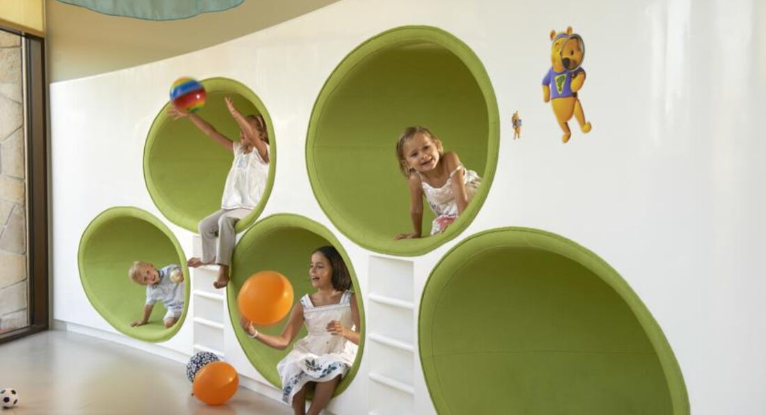 Детям в отеле действительно скучновато. Детский клуб есть (отдельное здание с кинотеатром (мульты на английском), небольшим выбором настольных игр, компьютерными играми для детей постарше, в будущем будет детский ресторан), аквагорки-2шт, но детей русских очень мало, поэт сын не оставался ни на минидиско, ни с аниматорами (есть русскоговорящие). Нам не хватало детской площадки с лазалками и компании)).