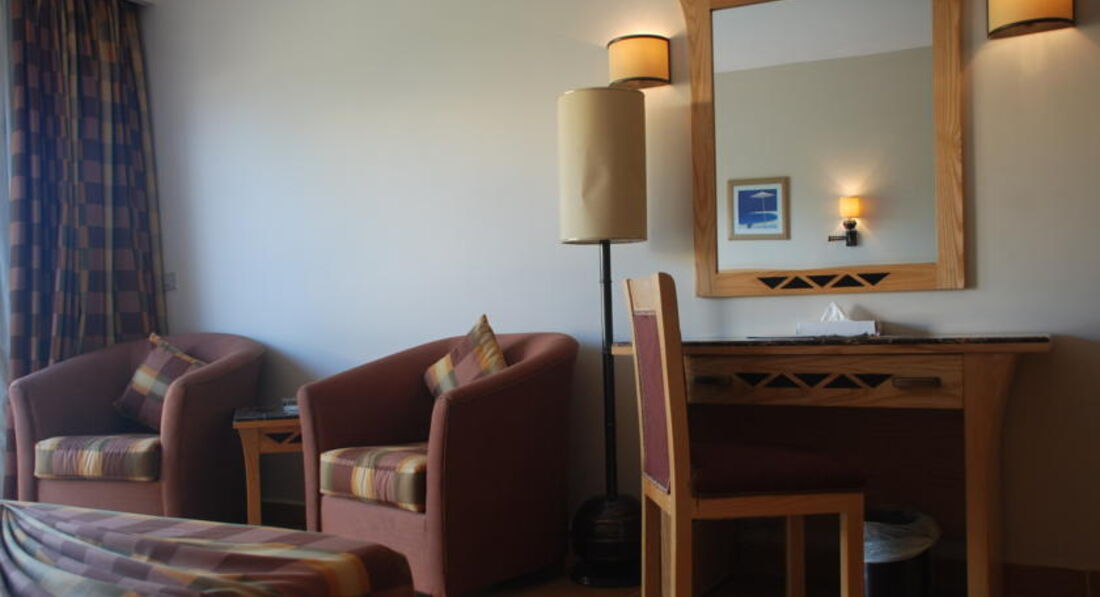 Приехали в отель около 23-00. Разместили через где-то через полчаса. В номере был подготовлен ужин - булочки, сыр, колбаса, салат из помидоров и огурцов, кусочки апельсина и финики, а также маленькая бутылочка воды. Внимание - эта бутылочка выдается ОДНА на весь срок пребывания. Далее можно покупать в баре или наполнять в ресторане- что все и делают. Ночью выяснилось, что кондиционер в номере не холодит, работает только вентилятор, да и горячей воды нет. На следующий день после 11-00 мне обменяли номер без всяких доплат. Общался с персоналом на смеси английский- русский.