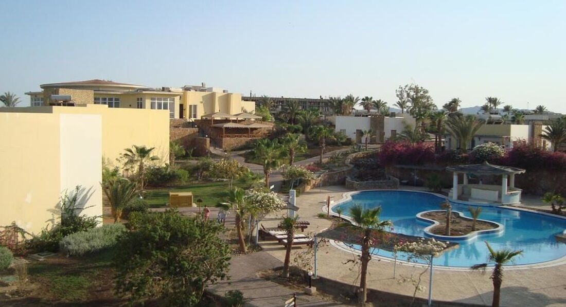 Отель соответсвует 4*. Внимательный и профессиональный персонал. Зеленая, в цветах, чистая территория. От Хургады до отеля 3 часа езды. За территорией отеля пустыня (есть тоже другие отели). Для спокойного отдыха (скутеры, катера и т.д. не беспокоят), чистое, прозрачное море. Из развлечений: дайвинг, ныряние с масками (наблюдать рыб, черепах, кораллы). В отеле итальянцы, есть белорусы, украинцы. Питание замечательное: курица, говядина, рыба, кальмары, разнообразные гарниры. Кондитер сводит с ума тортами и пироженками. Купаться с пирса, до моря три минуты ходьбы.