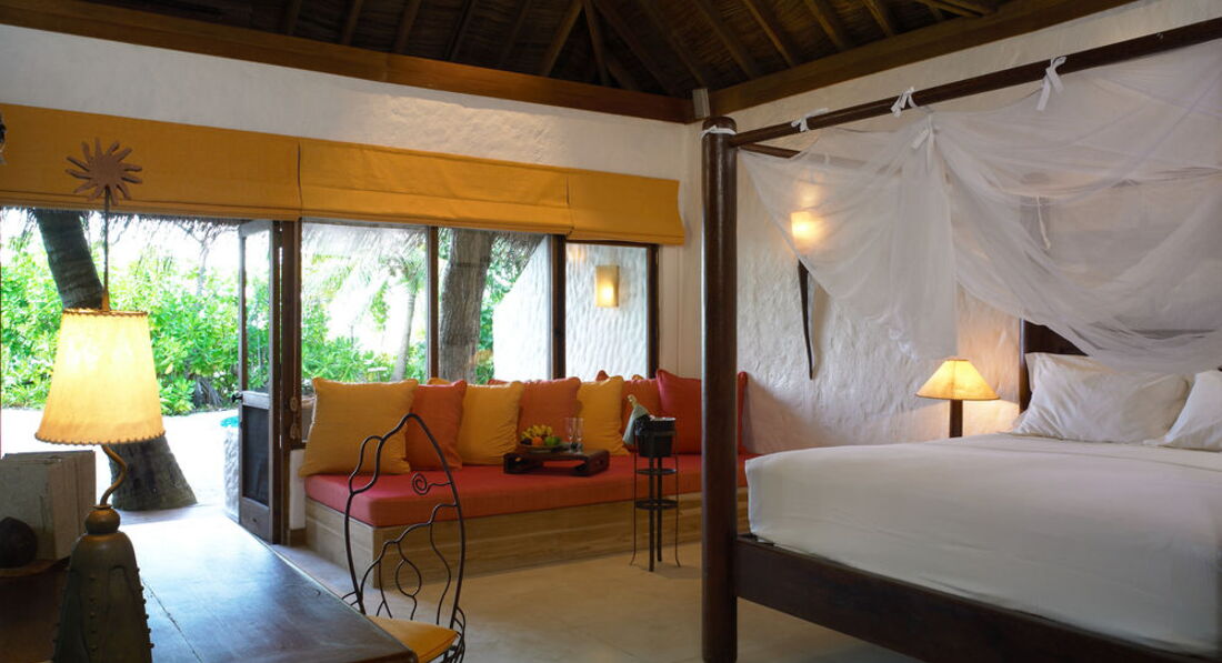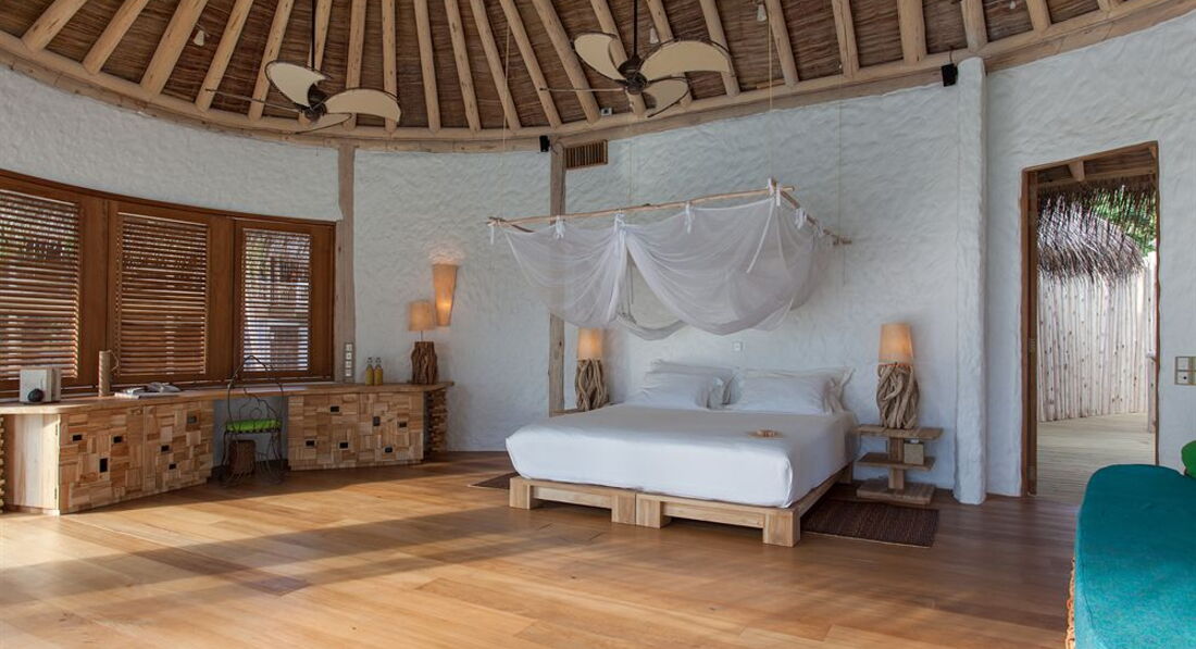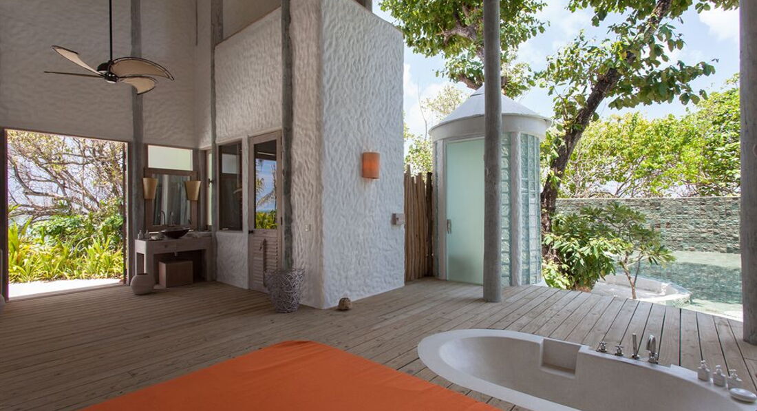 3 Soneva Fushi Villa (395 м2, макс. 3 або 2+1 чол.). Одноповерховий бунгало (вхід у віллу через фойє). Спальня з ліжком king-size та тахтою. Простора ванна кімната з ванною і душем.