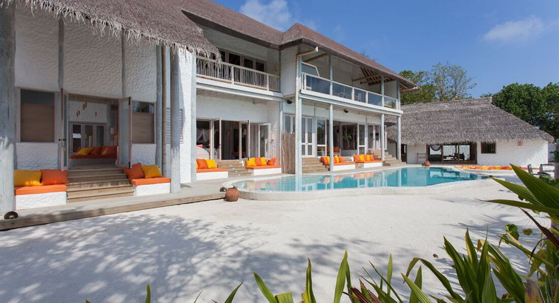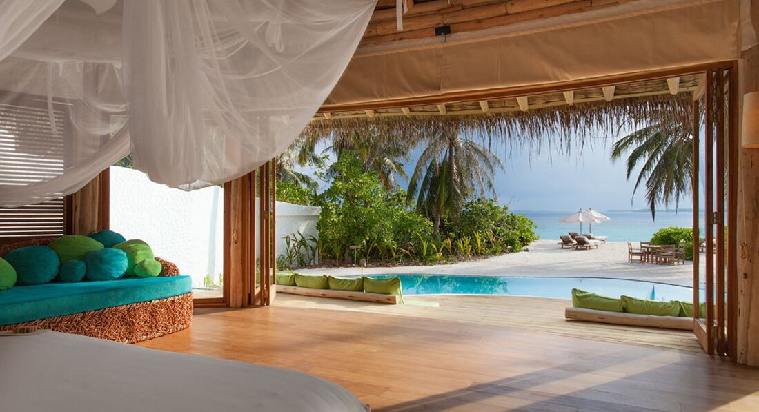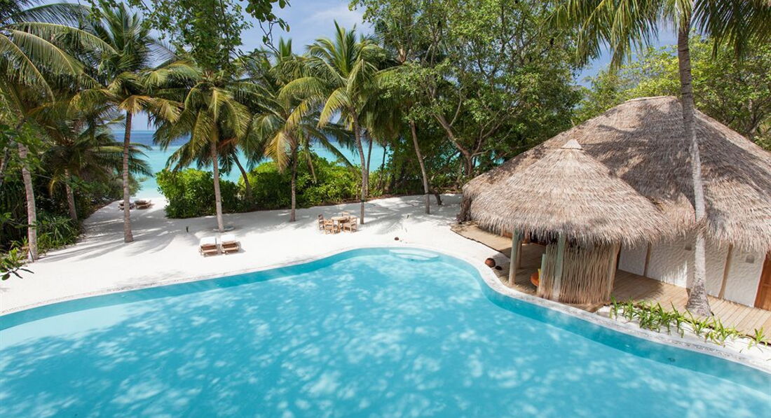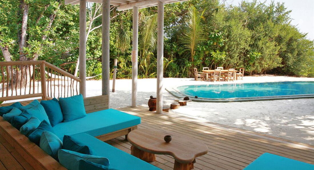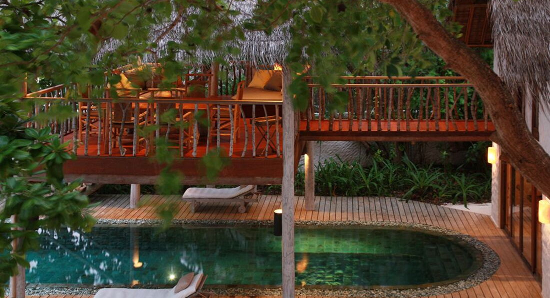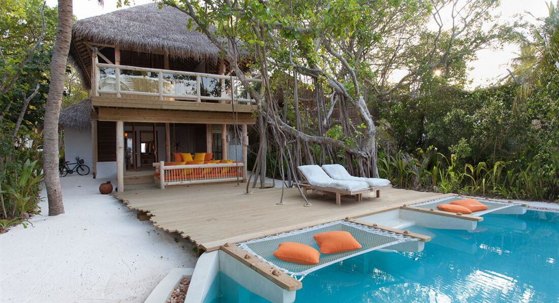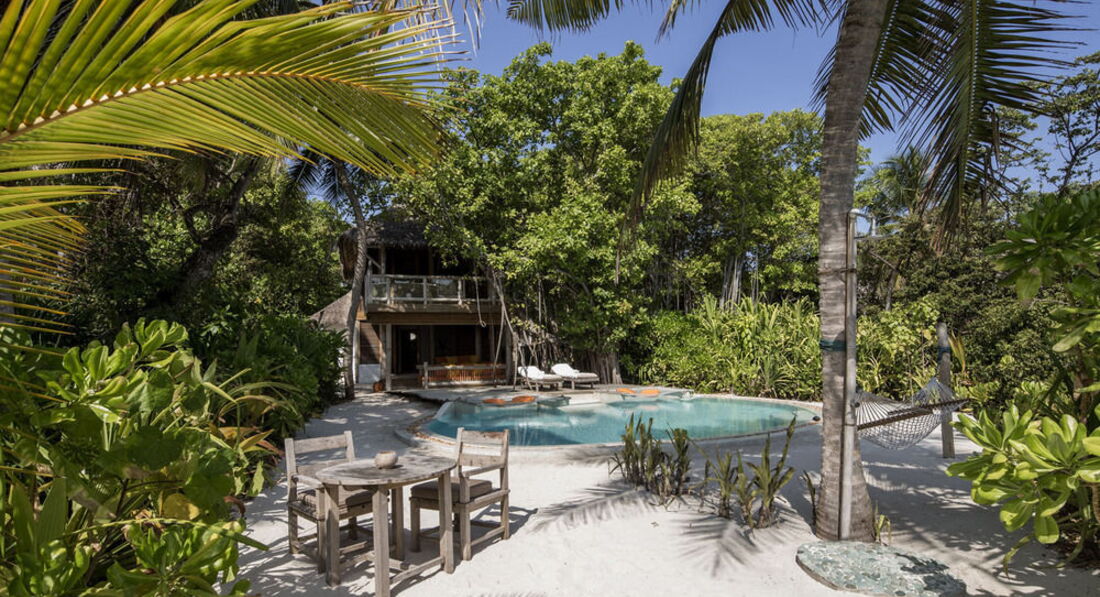 1 Soneva Fushi Villa 2-Bedroom with Pool (395 м2, макс. 6 або 4+2 чол.). Одноповерховий бунгало (вхід у віллу з тераси). Дві спальні з ліжками king-size, ванна кімната на відкритому повітрі з ванною та душем, басейн.
