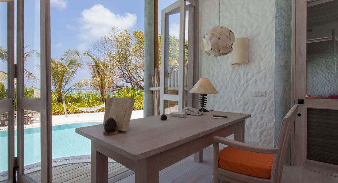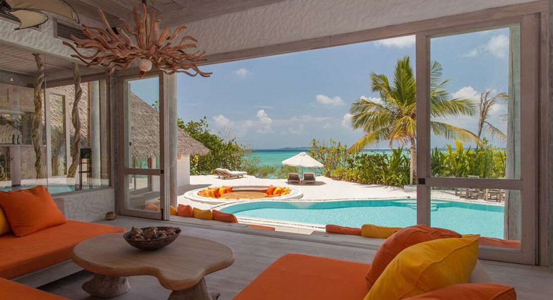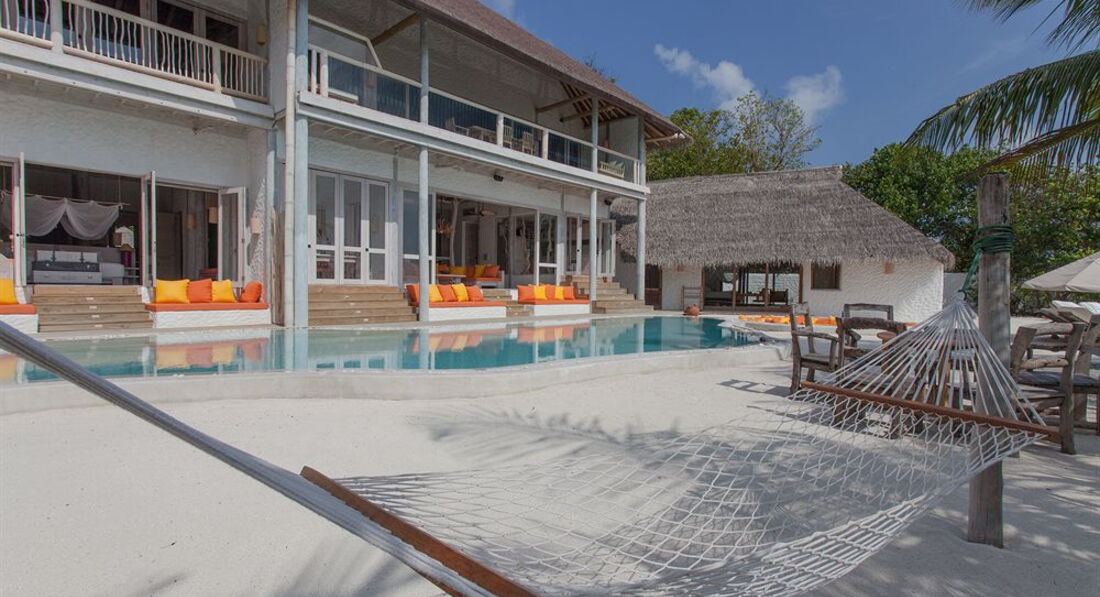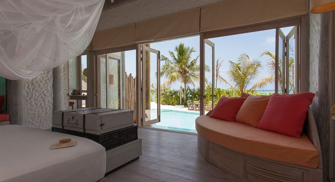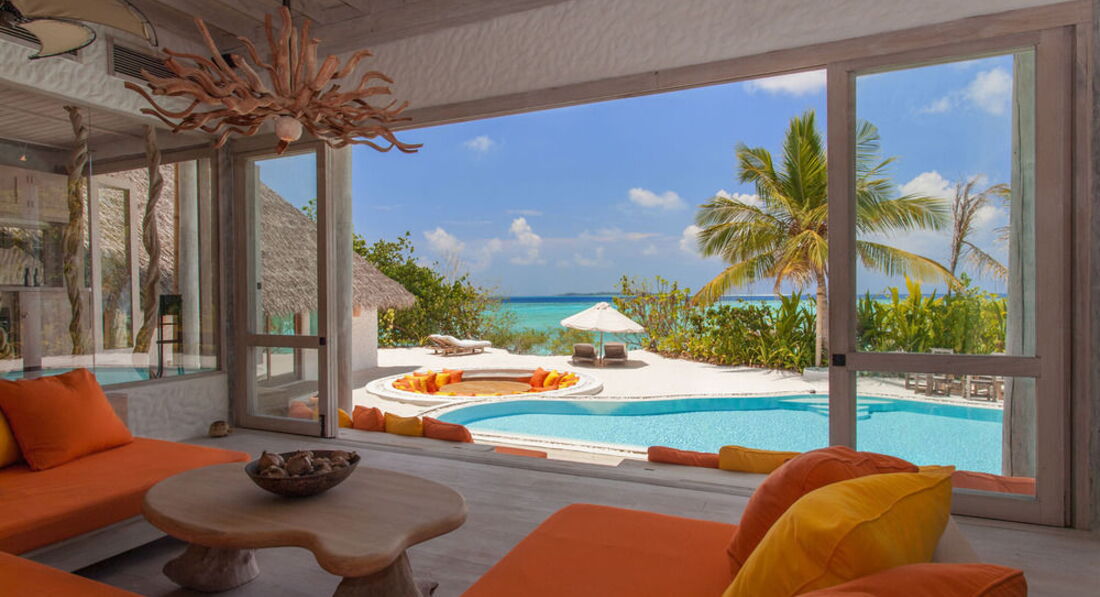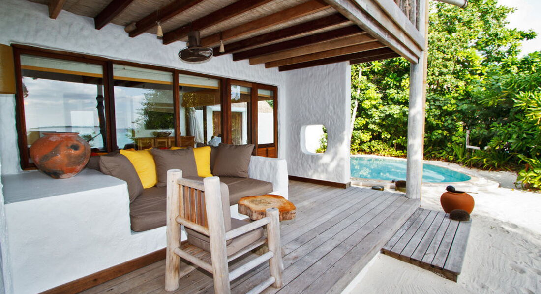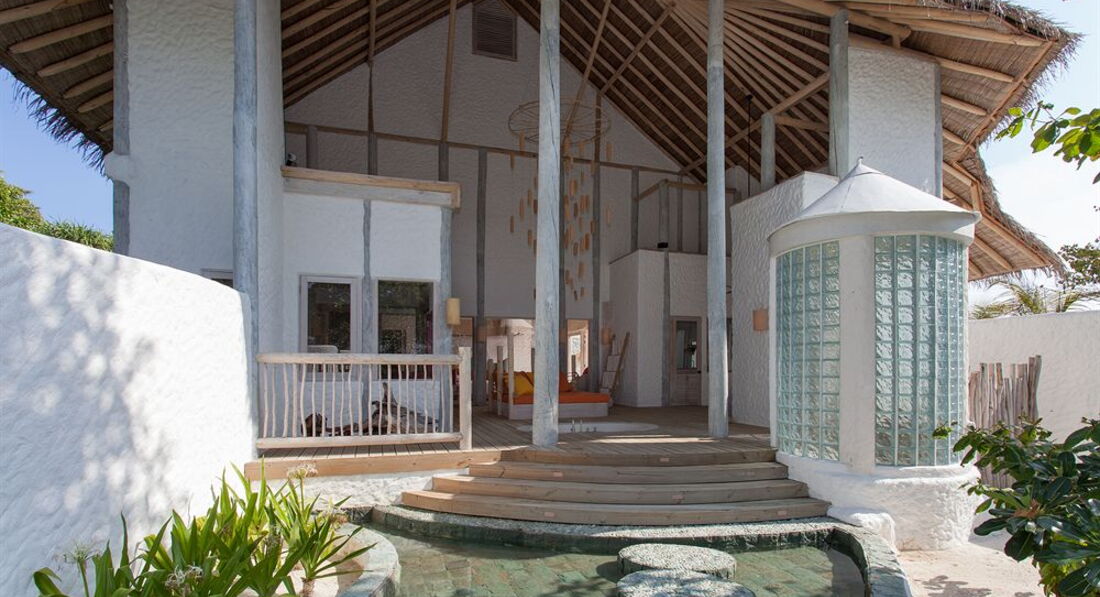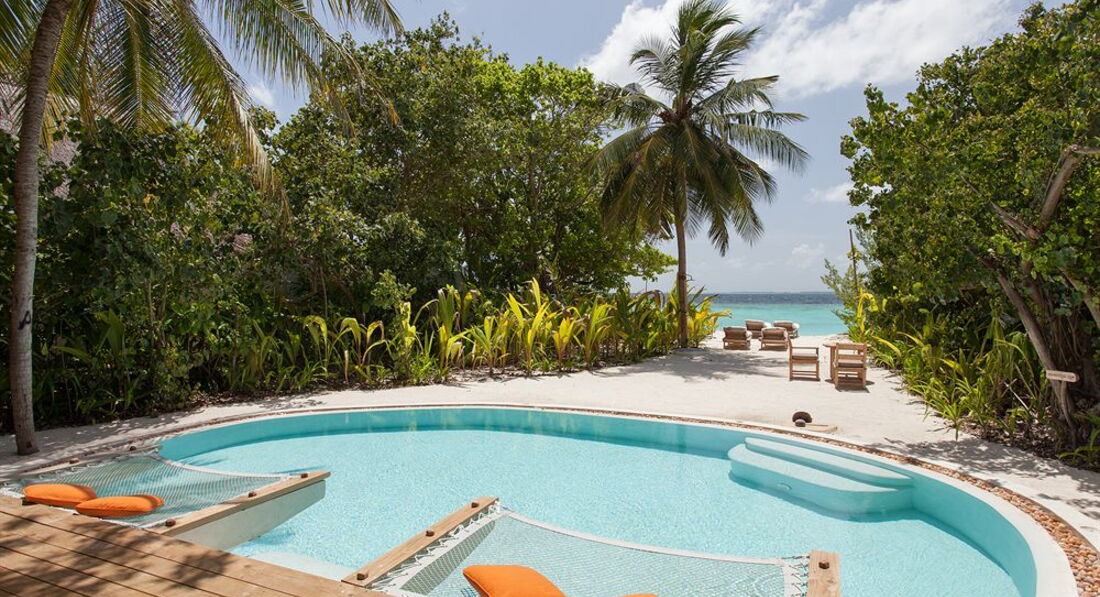 1 Soneva Fushi Villa 2-Bedroom with Pool (395 м2, макс. 6 або 4+2 чол.). Одноповерховий бунгало (вхід у віллу з тераси). Дві спальні з ліжками king-size, ванна кімната на відкритому повітрі з ванною та душем, басейн.