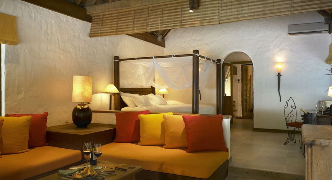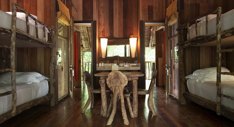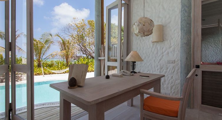 5 Crusoe Suite 2-Bedroom with Pool (649 м2, макс. 6 або 4+2 чол.) / 2 Crusoe Suite 3-Bedroom with Pool (935 м2, макс. 8 або 6+2 чол.). Двоповерховий бунгало. У номерах Crusoe Suite 2-Bedroom with Pool – 2 спальні (ліжка king-size або twin) на першому та другому поверхах; у номерах Crusoe Suite 2-Bedroom with Pool – 2 спальні (ліжка king-size або twin) на першому поверсі та 1 спальня (ліжко king-size або twin) на другому поверсі. Вітальня з диваном або софою, ванна кімната на вулиці з ванною і душем, басейн. Балкон на другому поверсі. Холодильник для вина.