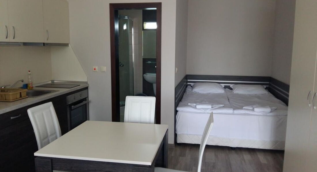 Studio – одна кімната: одне двоспальне ліжко, обладнаний кухонний куточок (плита, мікрохвильова піч, холодильник, електрочайник, посуд), макс. 2 дор., 30 м2;