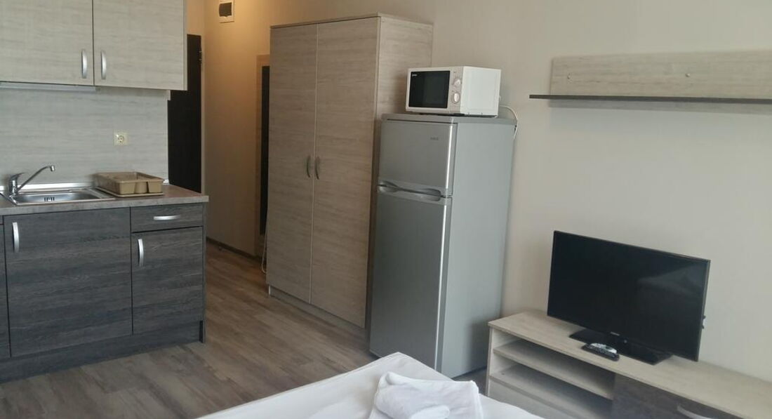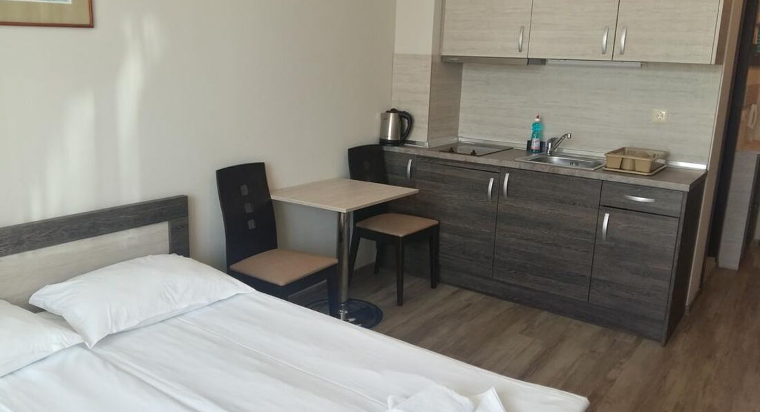 • Studio (одна кімната: одне двоспальне ліжко, обладнаний кухонний куточок (плита, мікрохвильова піч, холодильник, електрочайник, посуд), макс. 2 чол., 25 м2)