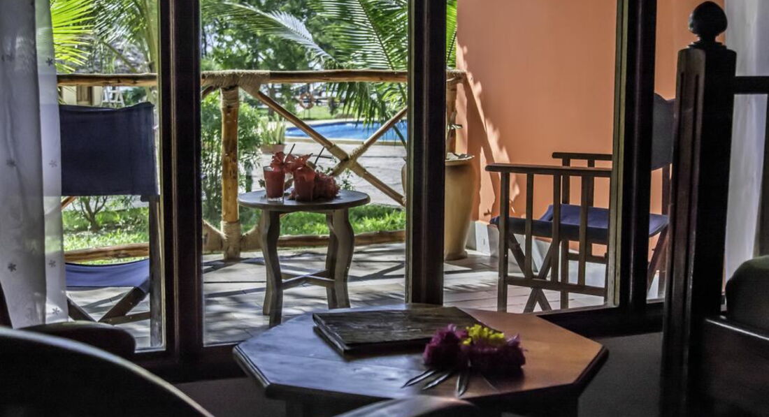 Deluxe Bungalow Room (Номери оточені тропічним садом і розташовані в 1-му та 2-му рядах, поряд з громадськими зонами готелю з басейном і видом на океан. Зручні та просторі номери (55 кв.м.) оснащені унікальним поєднанням Zanzibarian меблів та аксесуарів з типовими африканськими квітами Кондиціонер, стельовий вентилятор, ванна кімната з душовою кабіною Насолодіться дивовижним видом з тераси (18 кв.м.) на басейн та Індійський океан.)