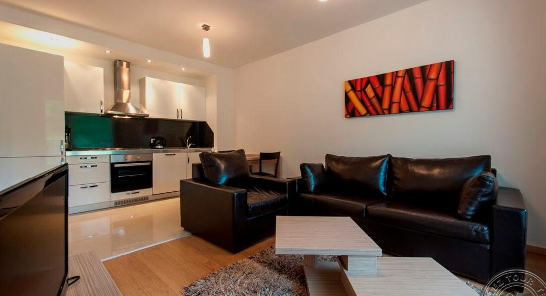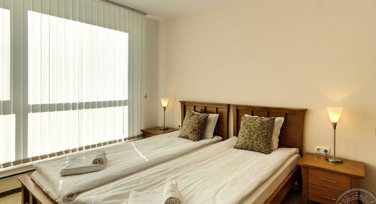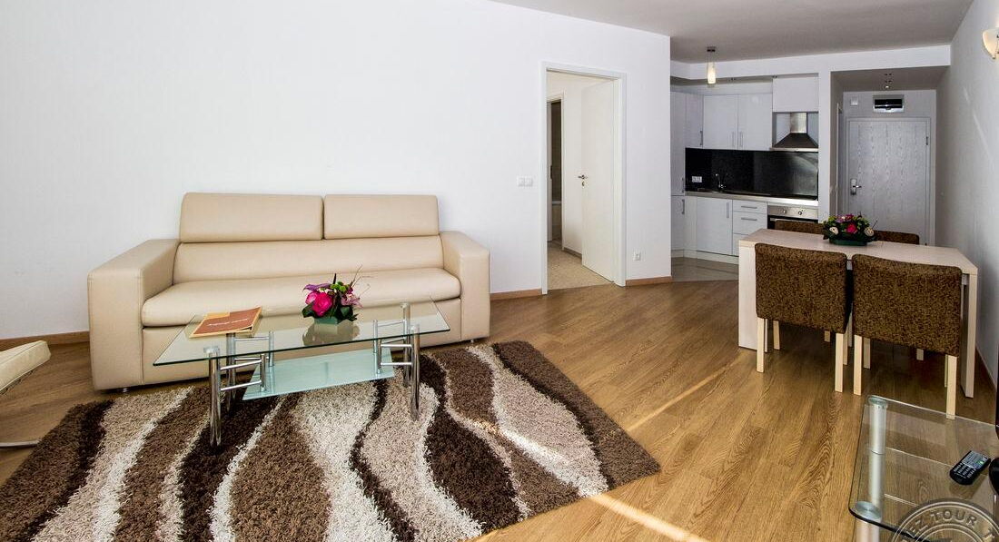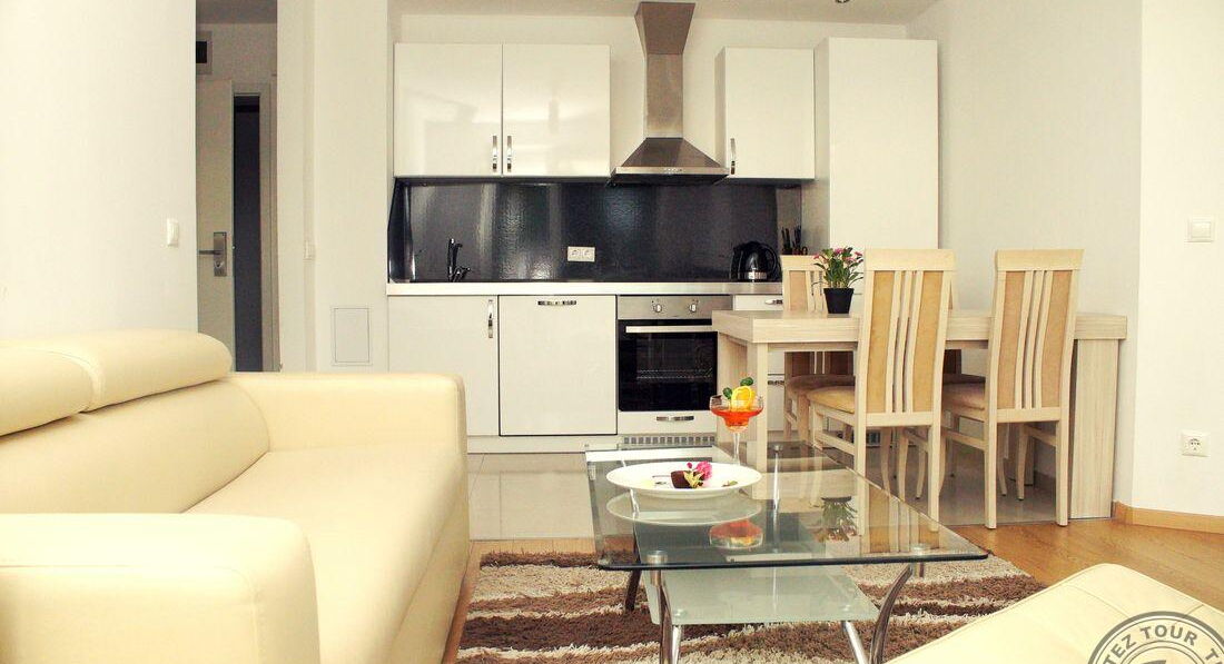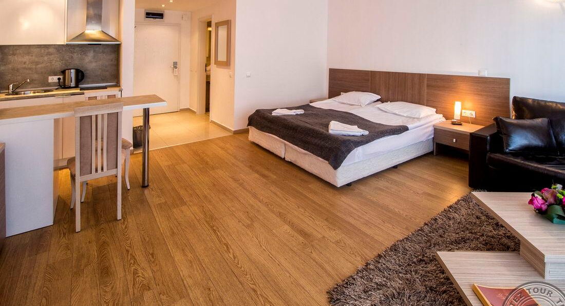• One Bedroom Apartment (спальня з двома односпальними або одним двоспальним ліжком, вітальня з розкладним диваном, обіднім столом і кухонним блоком (електрочайник, холодильник, тарілки та прилади) та обіднім столом, є суміжні двері, макс. 2+2 або 3 чол. ., 50 м2)