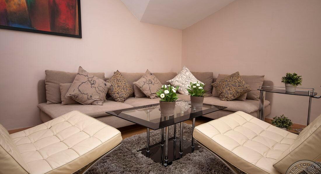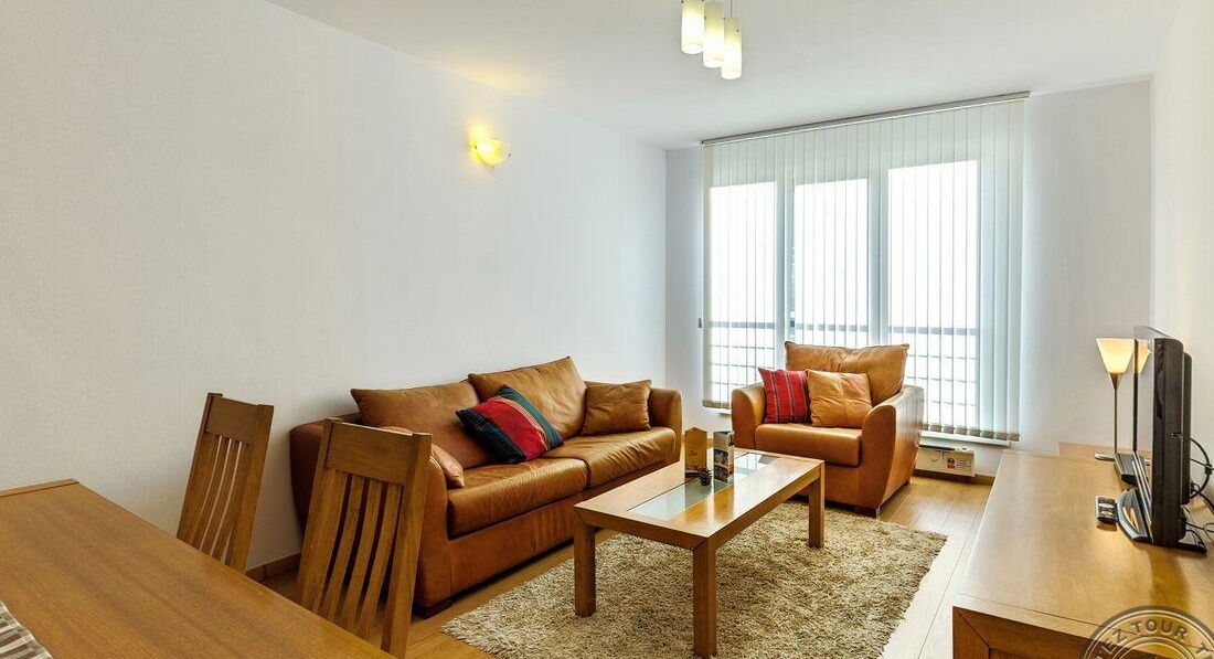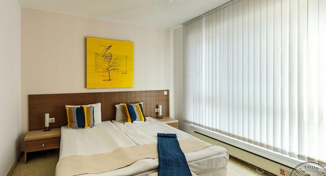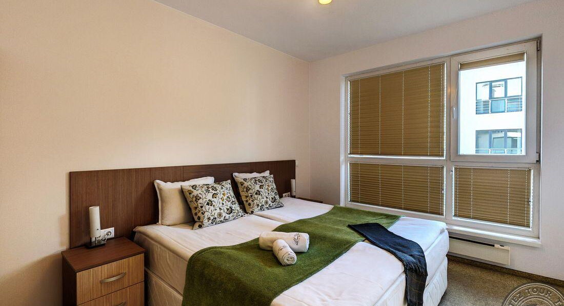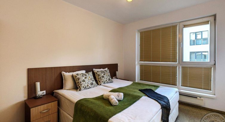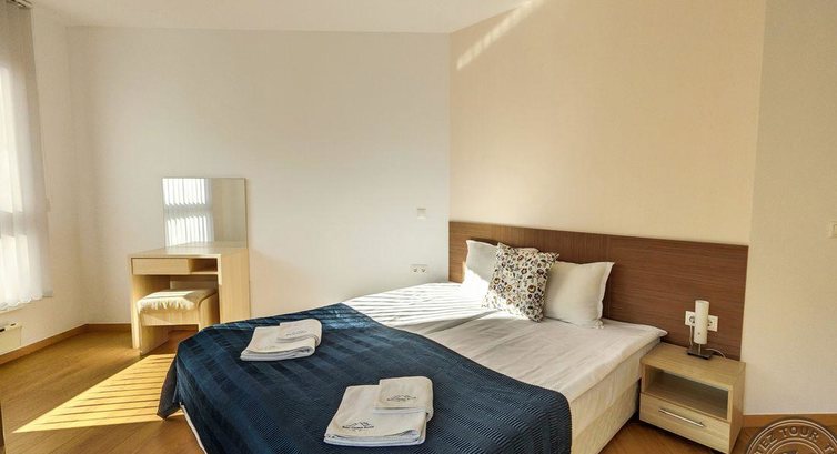 • One Bedroom Apartment (спальня з двома односпальними або одним двоспальним ліжком, вітальня з розкладним диваном, обіднім столом і кухонним блоком (електрочайник, холодильник, тарілки та прилади) та обіднім столом, є суміжні двері, макс. 2+2 або 3 чол. ., 50 м2)
