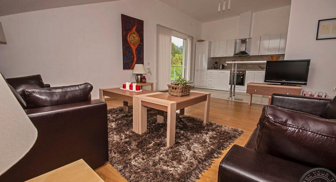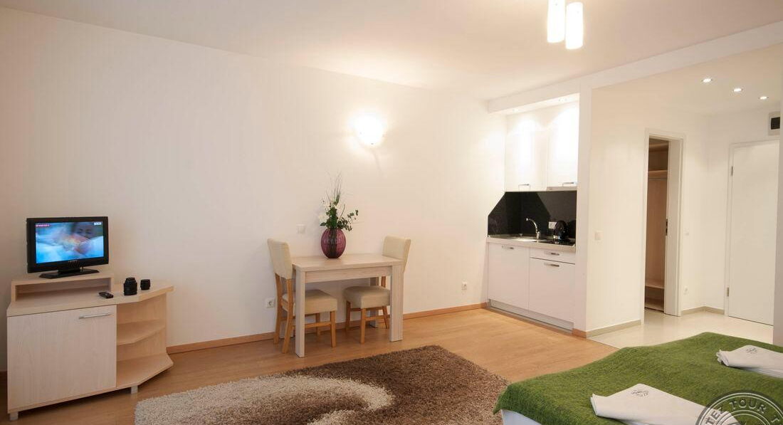 • Studio (два односпальні або одне двоспальне ліжко, обідній стіл, кухонний блок (електрочайник, холодильник, тарілки та прилади), макс. 2 чол., 30 м2)