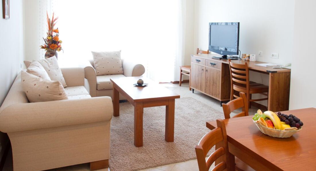 • Family Apartment (в апартаментному корпусі, спальня з одним двоспальним ліжком, вітальня з розкладним диваном, обладнаний кухонний куточок (електрочайник, плита, мікрохвильова піч, холодильник, посуд та столові прилади) та обідній стіл, є міжкімнатні двері, душова кабіна). 3+1 чол., 50 м2)