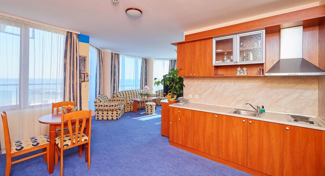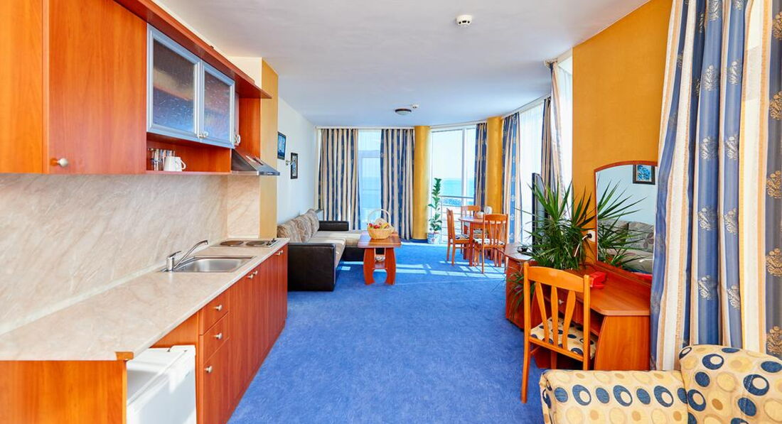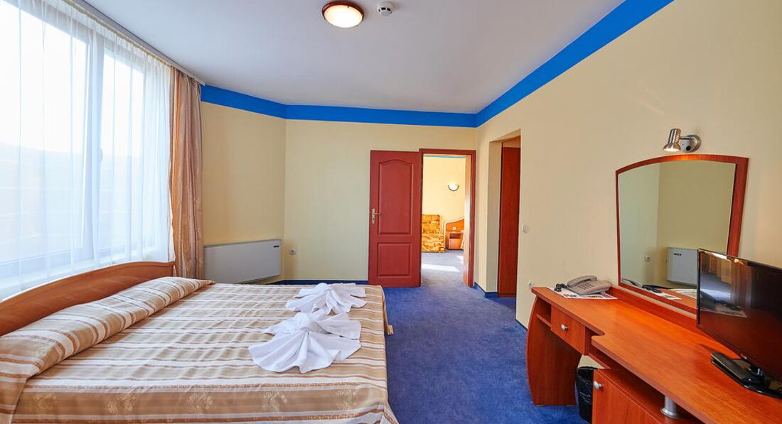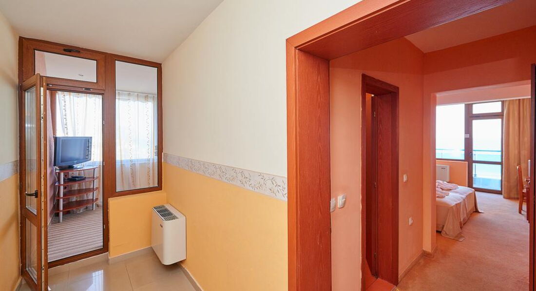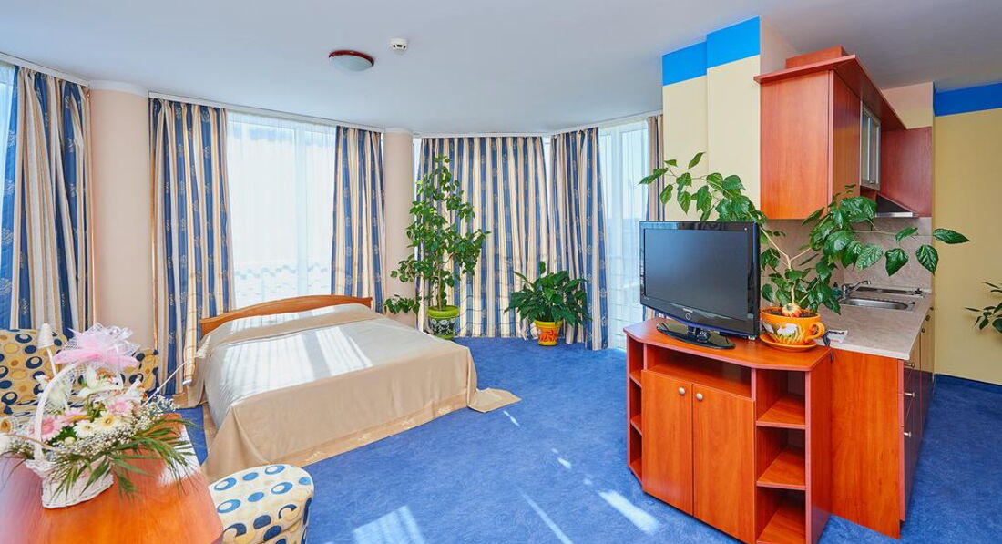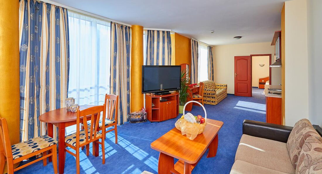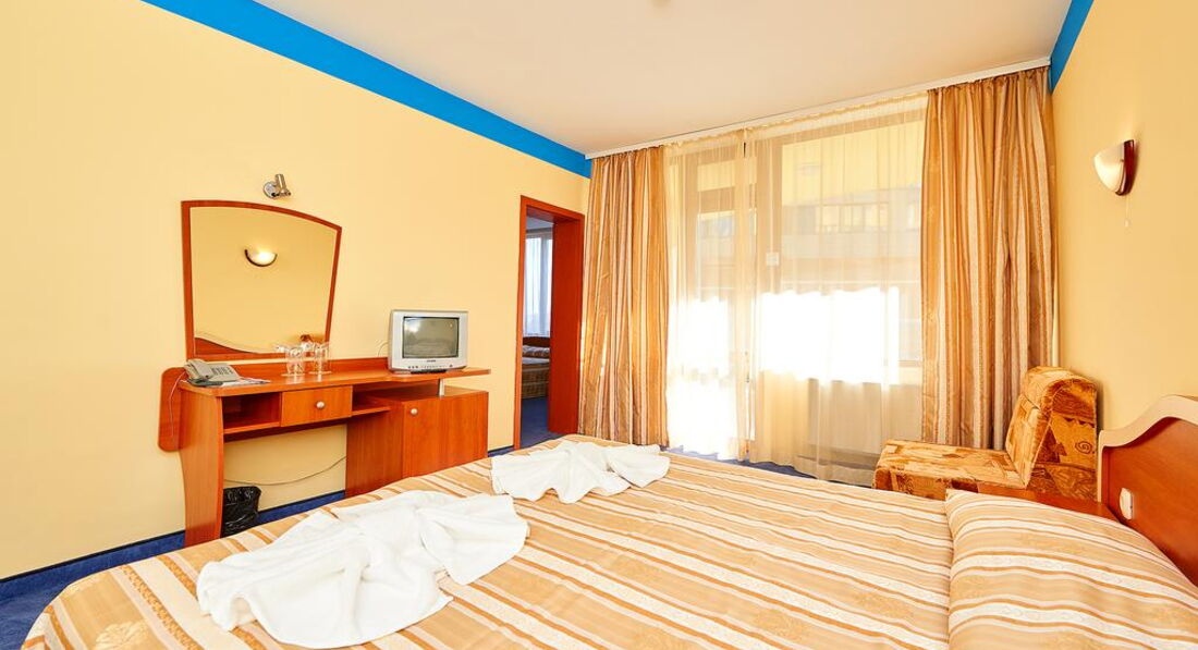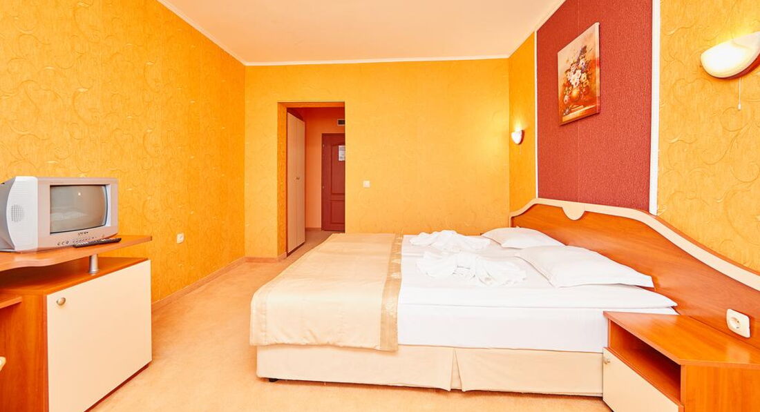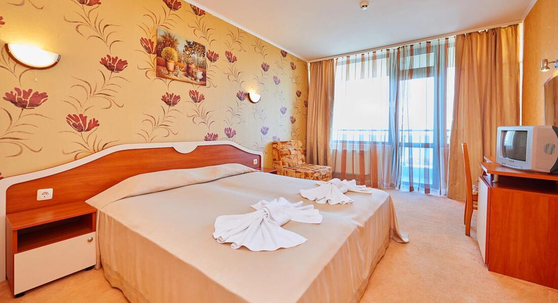 Номера обычные стандартные, как на сайте. Ресторан хороший на первом этаже. В этом году каждый день была живая музыка с 20-23 часов. Пел очень хороший певец Иван. Для гостей пел и русские, и болгарские песни. Завтраки нам в этом году показались лучше. Мяса, конечно, как в Турции, на завтрак не дают. Но сосиски, колбаса (нескольких видов), сыр, брынза, овощи, яйца, омлет, йогурт, масло, сладкие булочки, кекс, печенье и нарезанные фрукты всегда были. Чай, кофе, молоко тоже всегда были. Дома мы тоже едим одно и то же, как правило. Голодными не останетесь. Если будете брать завтраки и ужины, имейте в виду, что ужин не «шведский стол». Вам принесут бутылку воды, салат и второе блюдо по их меню. Наши соседи имели такие ужины, были довольны. Нам нравилось заказывать самим в любое время работы ресторана. Если вы прибудете в отель во время завтрака, имейте в виду, что в Болгарии не принято угощать кофе или завтраком новеньких, как в Турции, даже во время завтрака. Не рвитесь в ресторан попить кофейку, могут сделать замечание – это очень неприятно.
