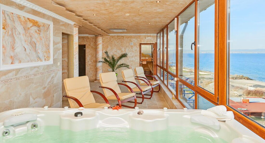 В этом году в отеле на 6 этаже открыли спа центр. Картинки на сайте все соответствуют действительности. Мы ходили несколько раз. Есть небольшая сауна, парная баня, джакузи. Это за 10 левов с человека можно пользоваться без ограничения (обычно 1,5-2 часа хватает). Соляная комната тоже стоит 10 левов с человека на 20 минут. У них есть прейскурант в каждом номере с ценами. Массажи всевозможные и процедуры разные. Хозяин сказал, что будут делать еще процедуры с грязью из Поморского озера, которое находится за отелем в 20 метрах. Хозяин Петр планирует работу отеля и зимой за счет спа центра и лечебных процедур с грязью.