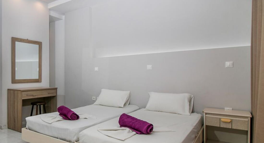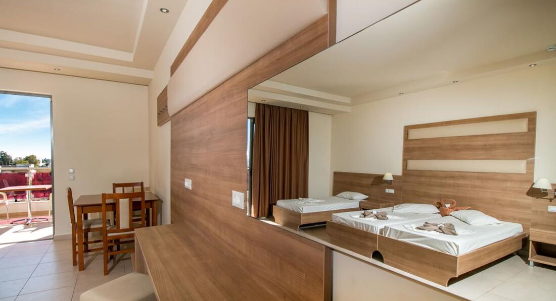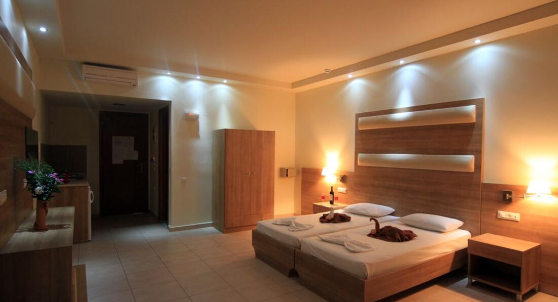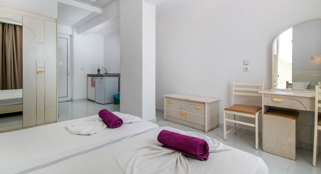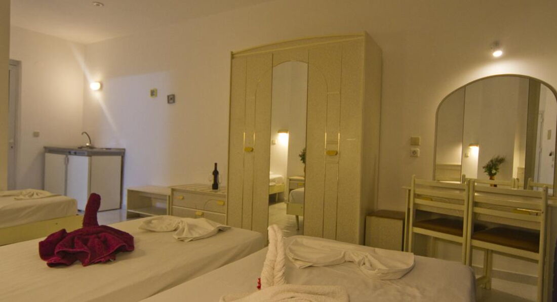 Типи номерів: • 8 Studio (20 м2., макс. Розм. 3 чол., Основний корпус, одна спальня та ванна, обладнаний кухонний куточок, вікна та балкони у всіх номерах). • 7 Superior Studio (25 м2, макс. розм. 3 чол., дод. корпус, одна спальня та ванна, обладнаний кухонний куточок, вікна та балкони у всіх номерах).У номері: • душ • електрочайник • кондиціонер (7 євро на день) • міні-холодильник (безкоштовно) • електроплита • стіл і стільці • wi-fi (платно) • сейф (платно)