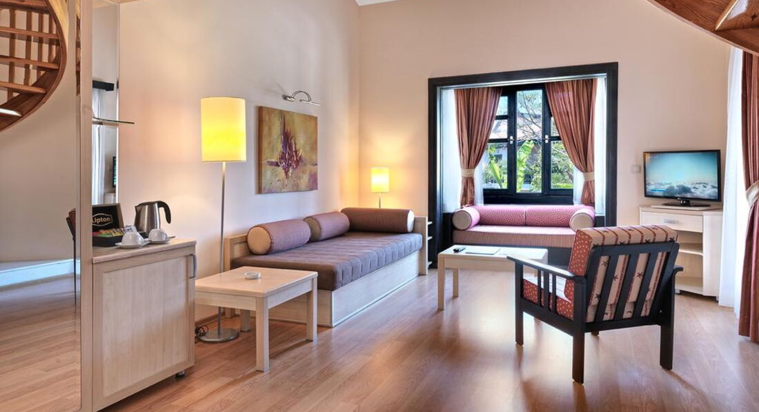 Мы жили в двухэтажном бунгало с джакузи. Номер стандартный, без изысков, но в нем было приятно находиться. На первом этаже – гостиная с 3 диванами, большой балкон и отдельная ванная комната с туалетом. На втором этаже – спальная с очень большой кроватью, маленький балкончик для принятия солнечных ванн, где вас никто не увидит, в отдельной комнате – джакузи с окном плюс ванная\туалет. И на первом, и на втором этажах есть телевизоры. Мини-бар пополняется ежедневно большим количеством баночек соков, колы,фанты, пива Эфес, воды EVIAN. Постоянно подкладывают орешки, чипсы.