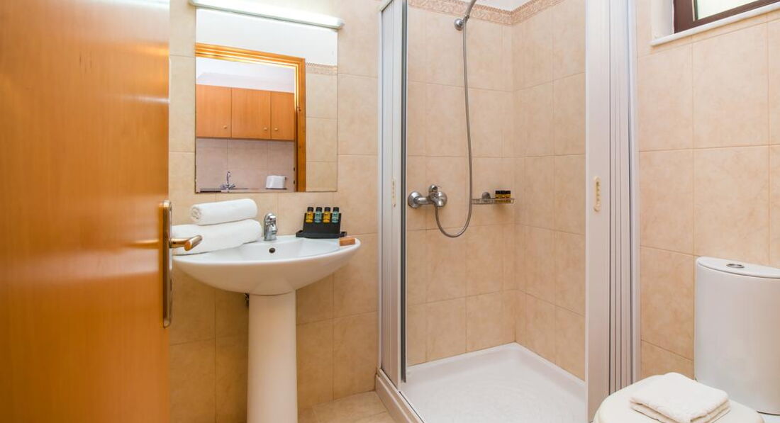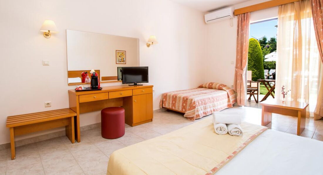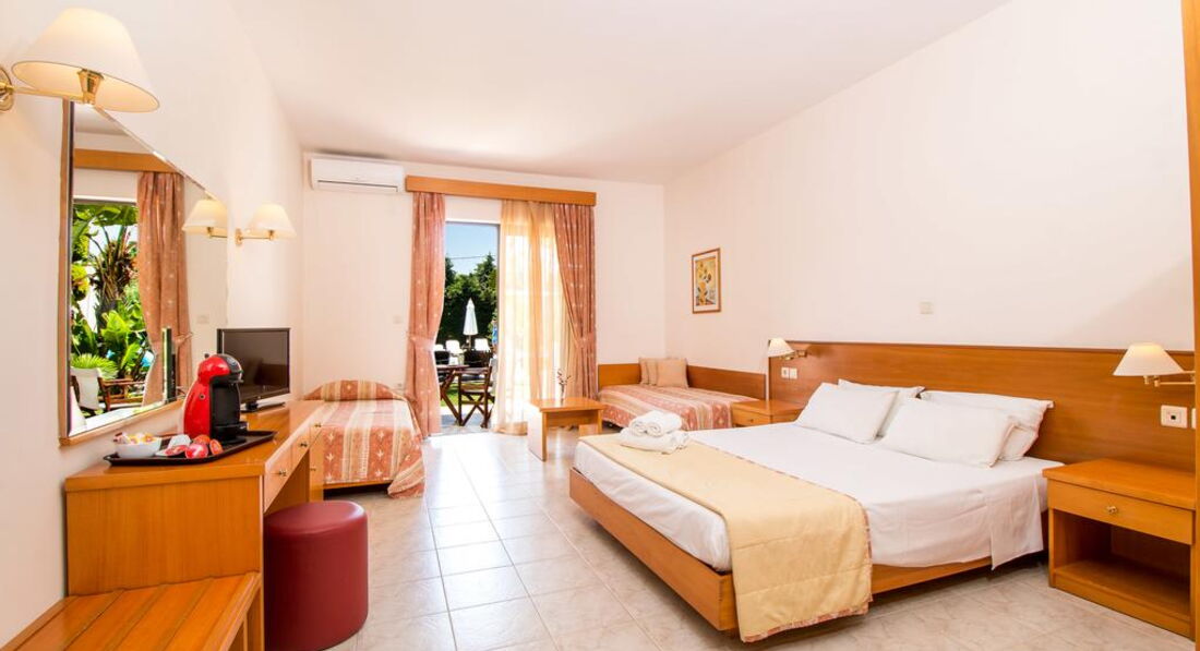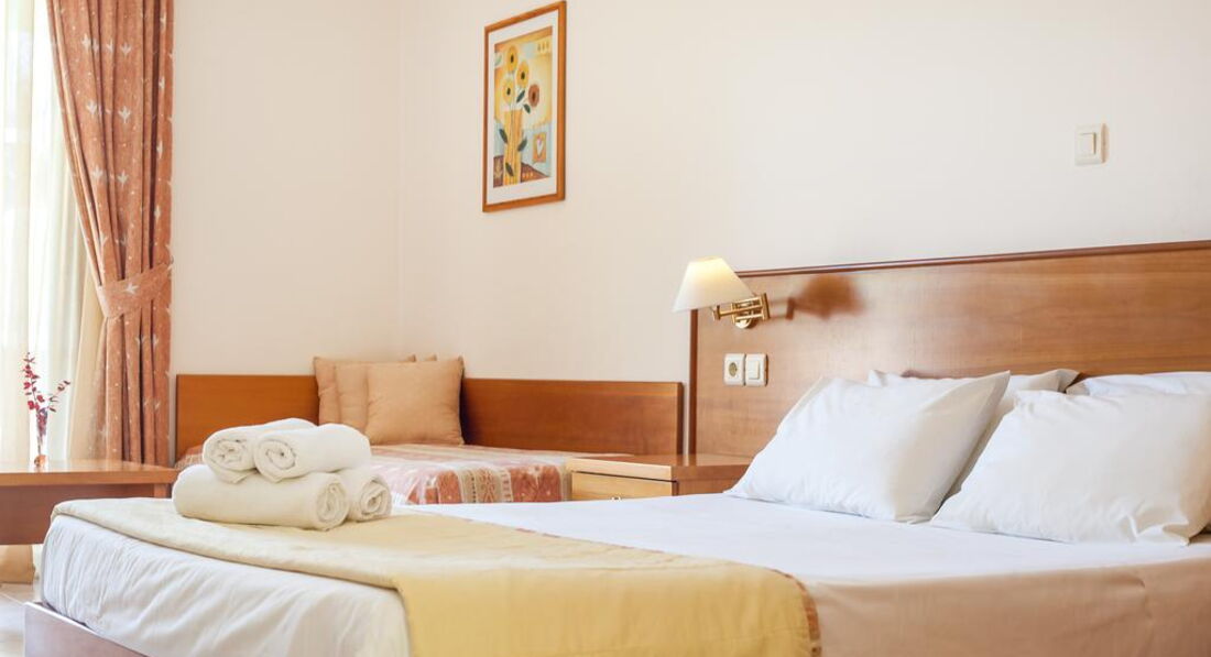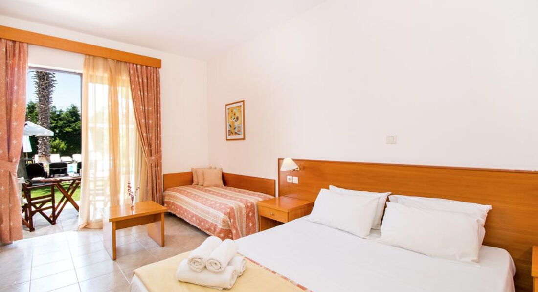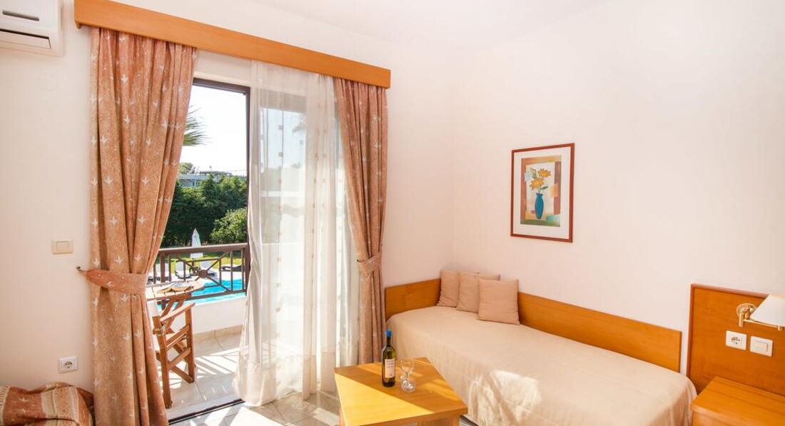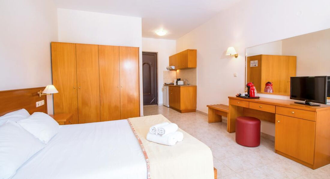 Типи номерів: studio A/C (однокімнатний номер, осн. ліжко – 2 односпальні або двоспальне, дод. – односпальне ліжко та розкладне, макс. 4 чол., 32 м2).У номері: сейф: у номері, безкоштовно, застава зміна білизни: 2 рази на тиждень кондиціонер: індивідуальний зміна рушників: 3 рази на тиждень підлога: керамічна плитка прибирання номера: щоденно фен: є балкон або тераса ТБ: супутникове зона кухні (чайник, столові прилади, кухонне начиння) душ Інтернет: Wi-Fi, безкоштовно міні холодильник