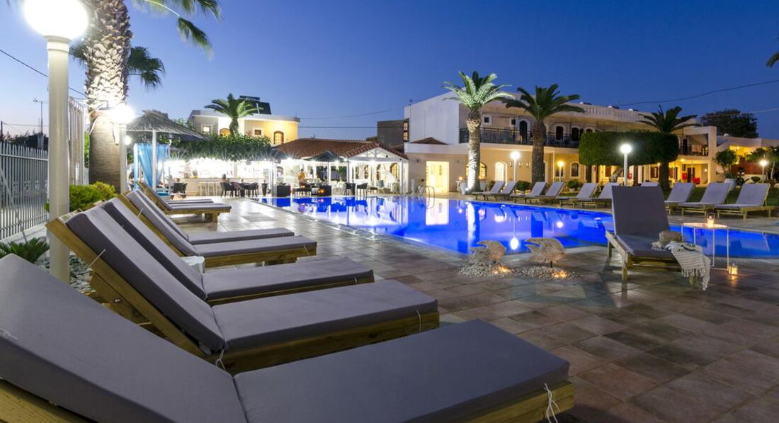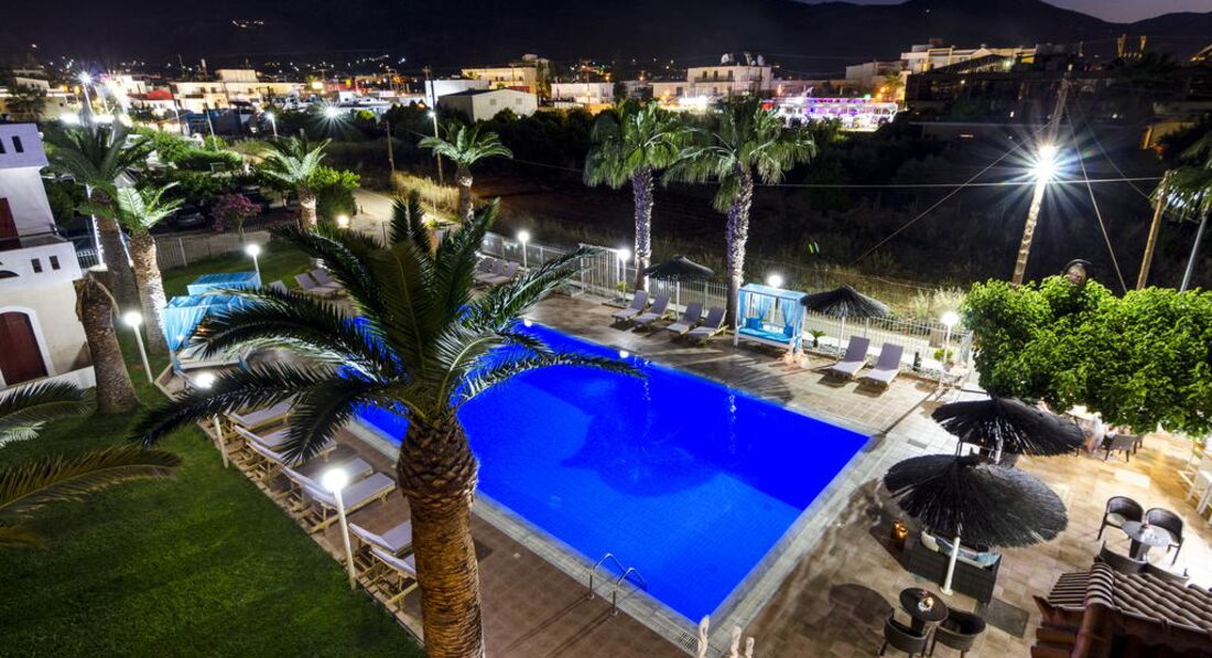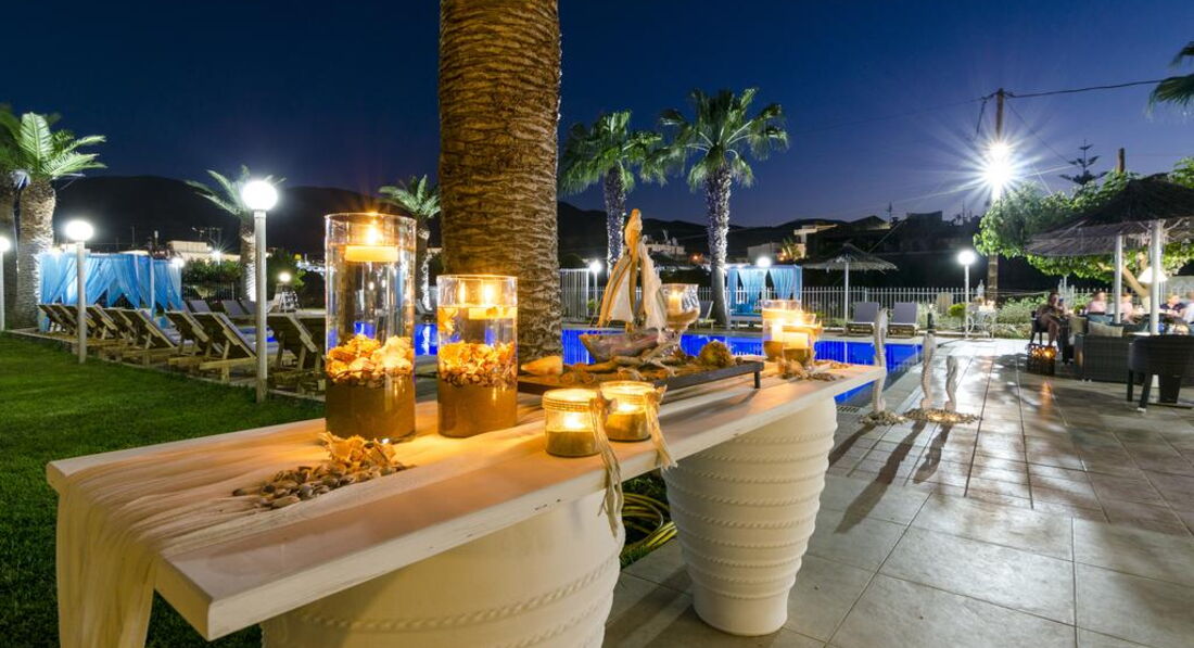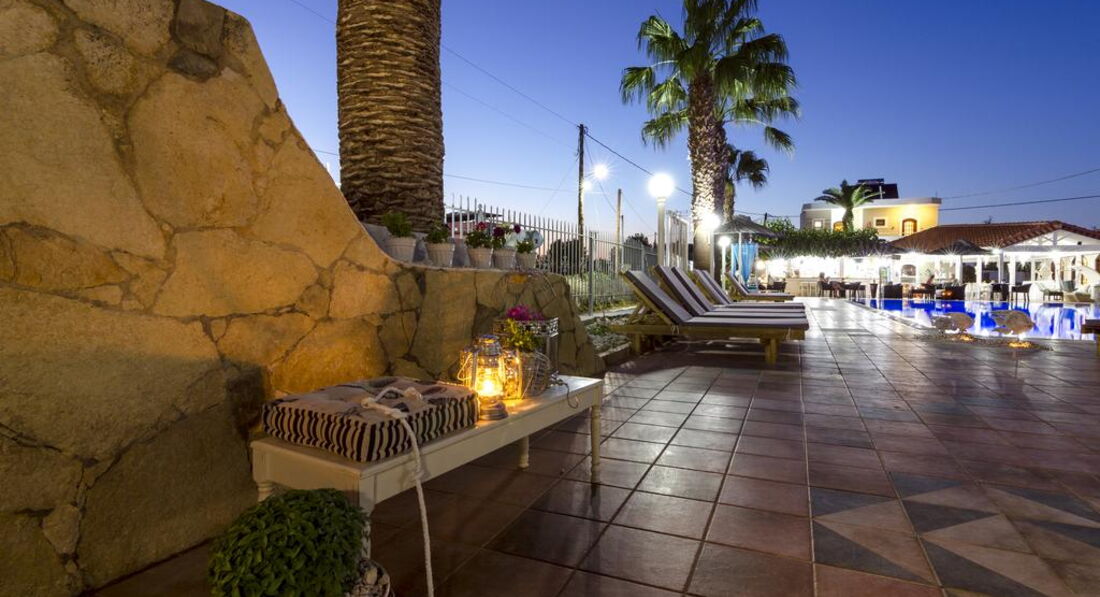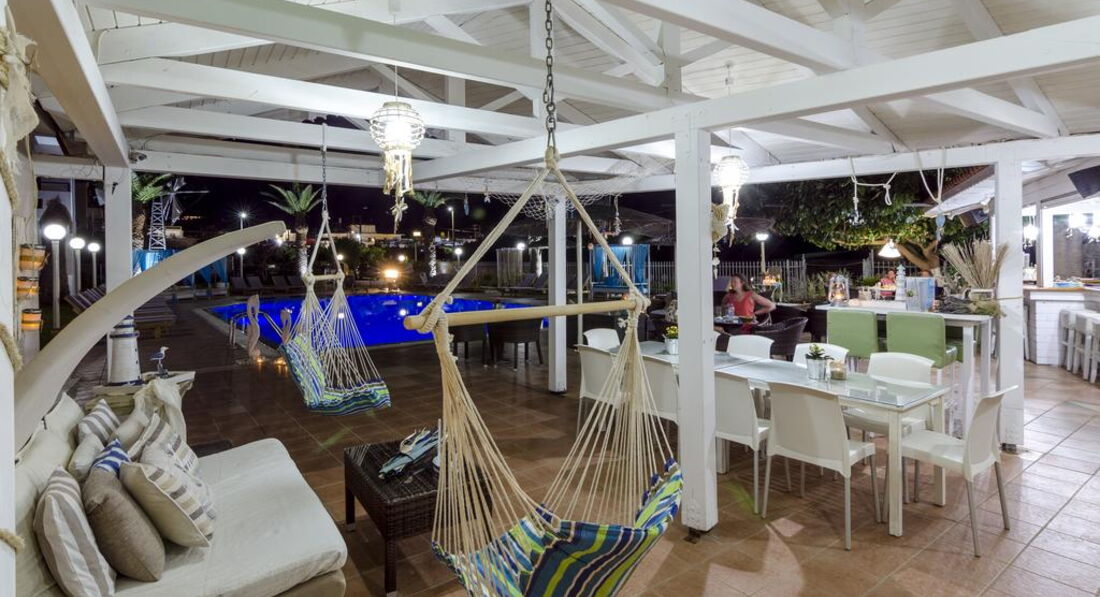 Територія та послуги: • бар-ресторан (середземноморська, грецька кухня, 10:00-22:00, бар – до 23:00) • wi-fi на території • автопарковка • велопарковка • тераса для загоряння • сад на території • пральня • оренда велосипедів • оренда автомобілів • камера зберігання Розваги та спорт: • відкритий басейн • більярд Для дітей: • дитяче ліжечко (за запитом, безкоштовно) • стільці в ресторані (за запитом, безкоштовно) • меню у ресторані (платно) Живлення: • BB – сніданок. • HB – сніданок та вечеря. Пляж: Громадський піщаний пляж за 150 м через дорогу від готелю. Парасольки та шезлонги – платно, пляжні рушники не надаються. До оплати приймаються кредитні картки: Visa, MasterCard.