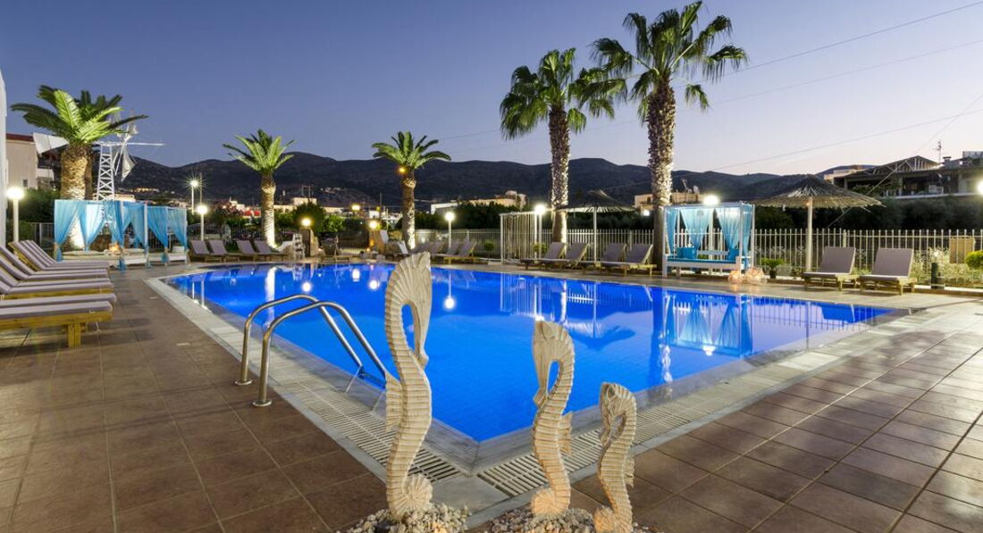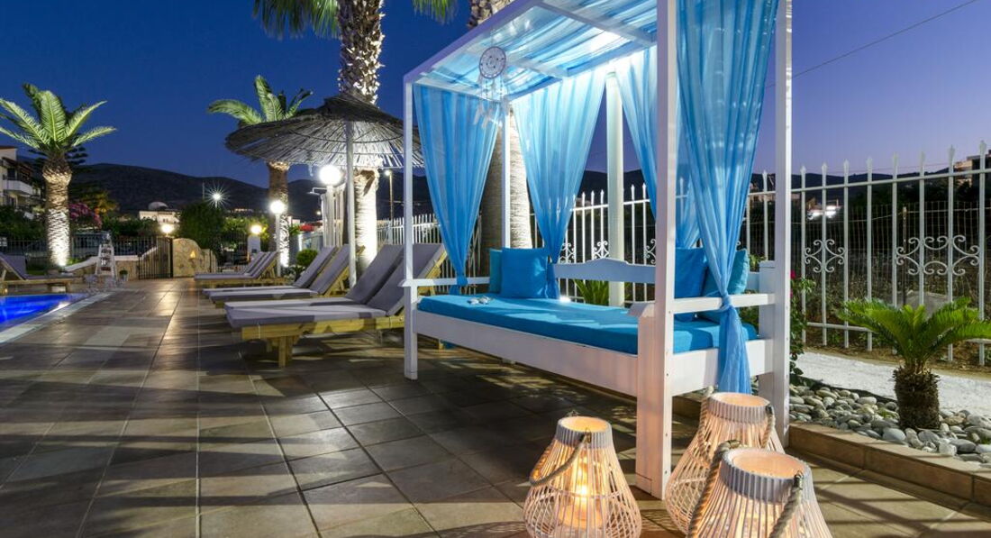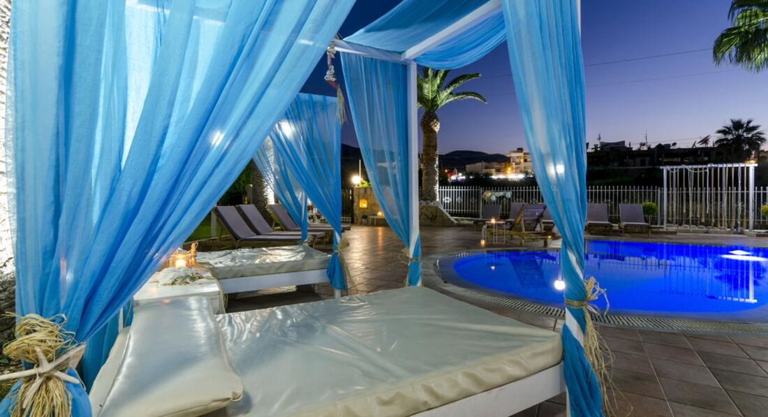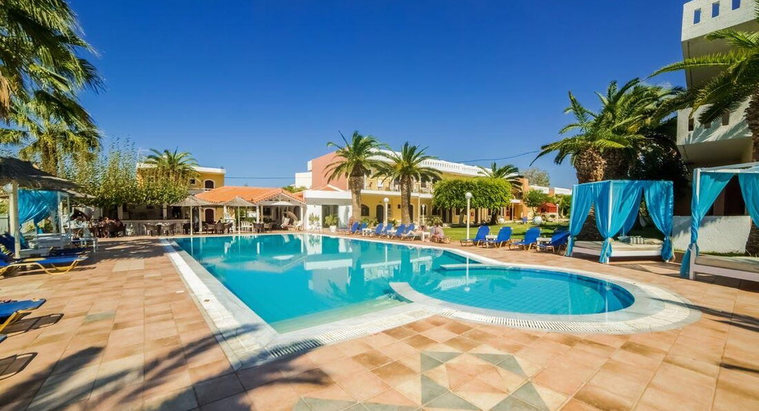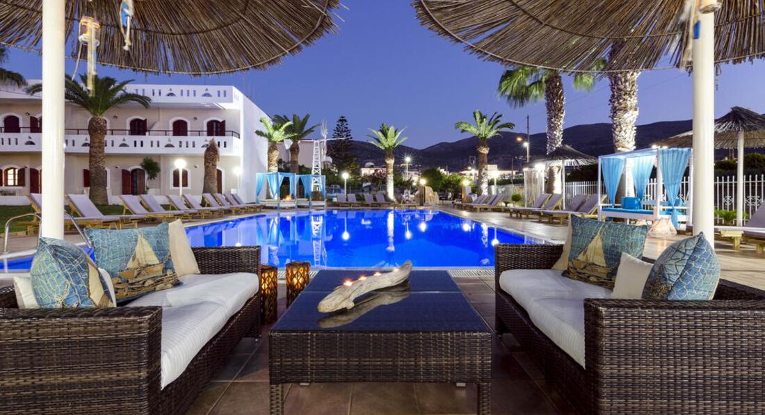 Територія та послуги: • бар-ресторан (середземноморська, грецька кухня, 10:00-22:00, бар – до 23:00) • wi-fi на території • автопарковка • велопарковка • тераса для загоряння • сад на території • пральня • оренда велосипедів • оренда автомобілів • камера зберігання Розваги та спорт: • відкритий басейн • більярд Для дітей: • дитяче ліжечко (за запитом, безкоштовно) • стільці в ресторані (за запитом, безкоштовно) • меню у ресторані (платно) Живлення: • BB – сніданок. • HB – сніданок та вечеря. Пляж: Громадський піщаний пляж за 150 м через дорогу від готелю. Парасольки та шезлонги – платно, пляжні рушники не надаються. До оплати приймаються кредитні картки: Visa, MasterCard.