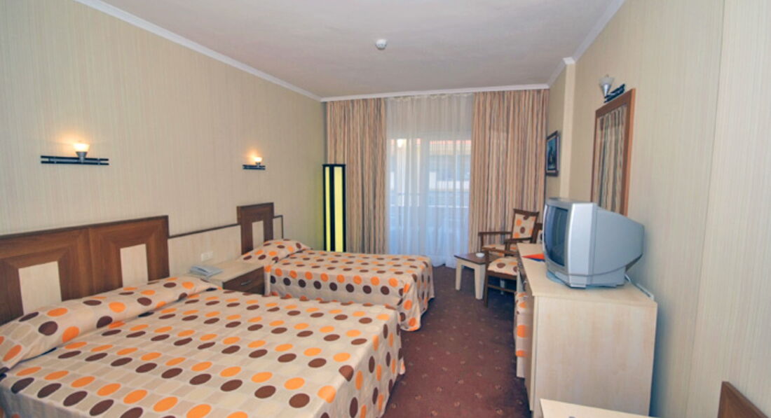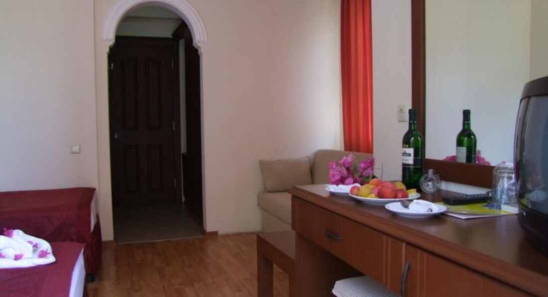 Отдыхали с мужем в июне месяце. Приехали в гостиницу в 8 утра, заселили только в 13 часов (хоть номера были свободные, так как мы все время сидели в холле никто с нее не выезжал). Сам отель не плохой, просторные чистые номера, красивый вид с окна. Интернет платный, можно договориться за 1 $ в день, работает хорошо и в номере, и возле бассейна. Персонал в отеле приветливый. Анимации и развлечений нету. Питание это что-то. Одно и то же с утра, днем и вечером. Фрукты в ужасном состоянии, сладости отвратетельные. Бар возле бассейна работает с 10 до 22 часов. Всегда есть пиво, вино, готовят коктейли. Бассейн чистый, горка работала каждый день по 2 раза. Пляж чистый, полотенца на лежаки брать нужно свои. До моря 3 минуты. Море прекраснейшее, чистое, теплое. Желательно заходить в воду в обуви, так как не совсем приятно ходить по гальке босыми ногами. На пляже можно бесплатно попить сок (порошковый), воду, чай, кофе. Все остальные напитки за деньги. В поселке очень красивая набережная, много зелени, есть где прогуляться, можно покататься на мопедах, велосипедах.