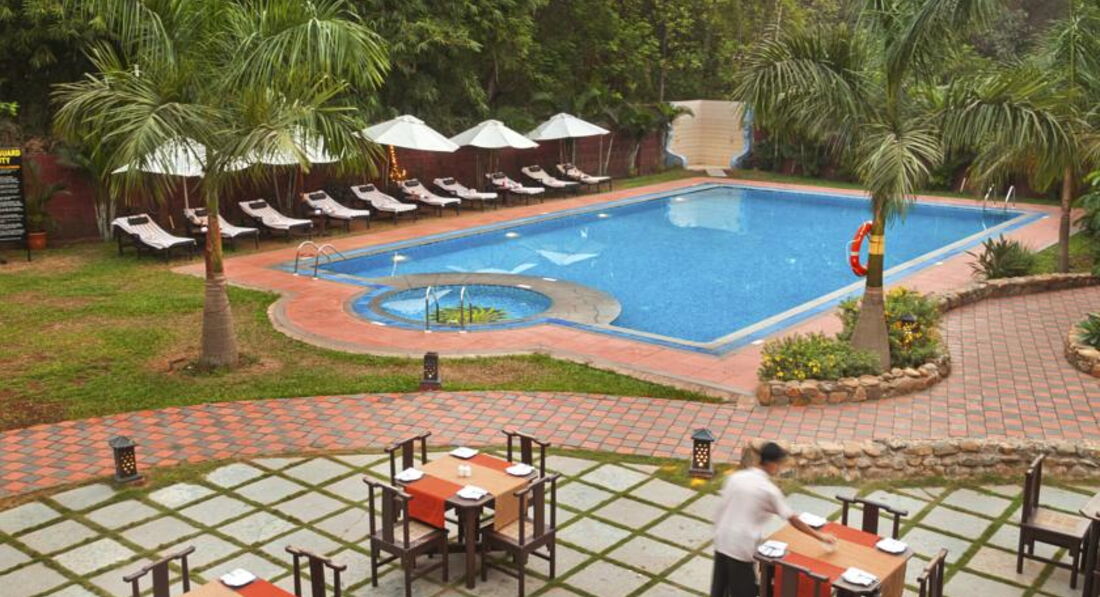 Очень уютный, чистый, ухоженный. По индийским меркам - имеет довольно большую собственную территорию, бассейн с шикарными кожанными лежаками, площадку для приёма пищи под открытым небом и отдельно - в помещении, как я понял - на сезон дождей. В сезон дождей у них наплыв индийцев из Дэли, Мумбая и прочих крупных городов.