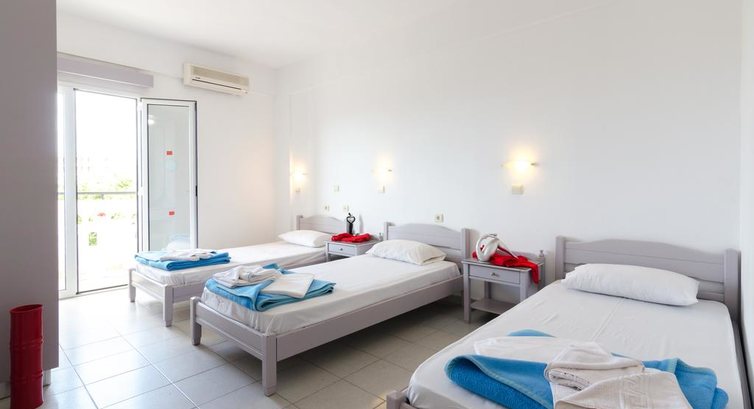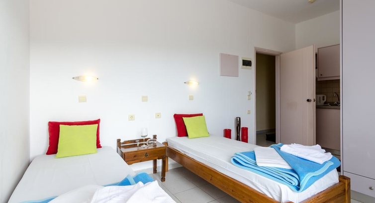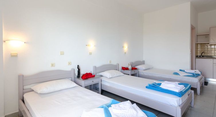 Типи номерів: • 13 Double Studio Room (20 м2, вид на басейн або околиці, макс. розм. 2 чол., одна спальня та ванна, обладнаний кухонний куточок, балкон або тераса) • 5 Triple Studio Room (25 м2, вид на басейн або околиці, макс. розм. 3 чол., одна спальня та ванна, обладнаний кухонний куточок, балкон або тераса) • 4 Quadruple Apartment (30 м2, вид на басейн або околиці, макс. розм. 4 чол., одна спальня та вітальня, розділені міжкімнатними дверима, ванна кімната, обладнаний кухонний куточок, балкон або тераса)У номері: • душ • електрочайник • індивідуальний кондиціонер (платно) • міні-холодильник (безкоштовно) • праска та прасувальна дошка (за запитом) • стіл і стільці • wi-fi (платно) • сейф (платно)
