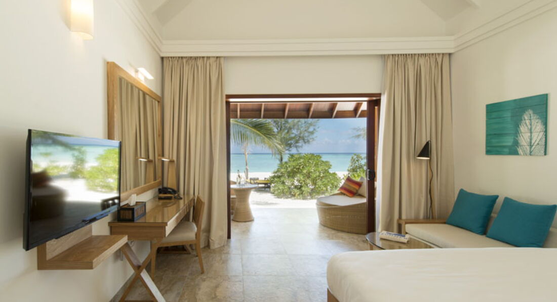 16 Premium Beach Villa (45 кв.м., в саду і має прямий вихід до пляжу. У номері двоспальне ліжко, велика веранда з лежаками та кріслами, ванна кімната з джакузі та туалетним приладдям.),