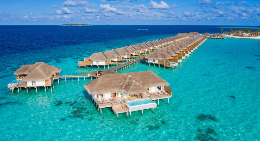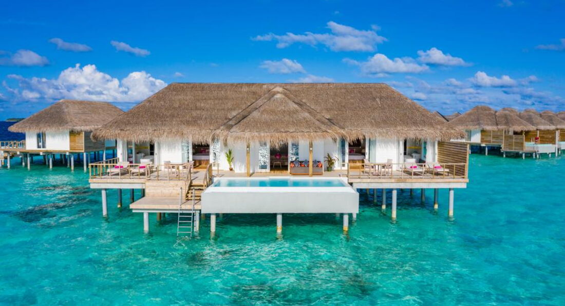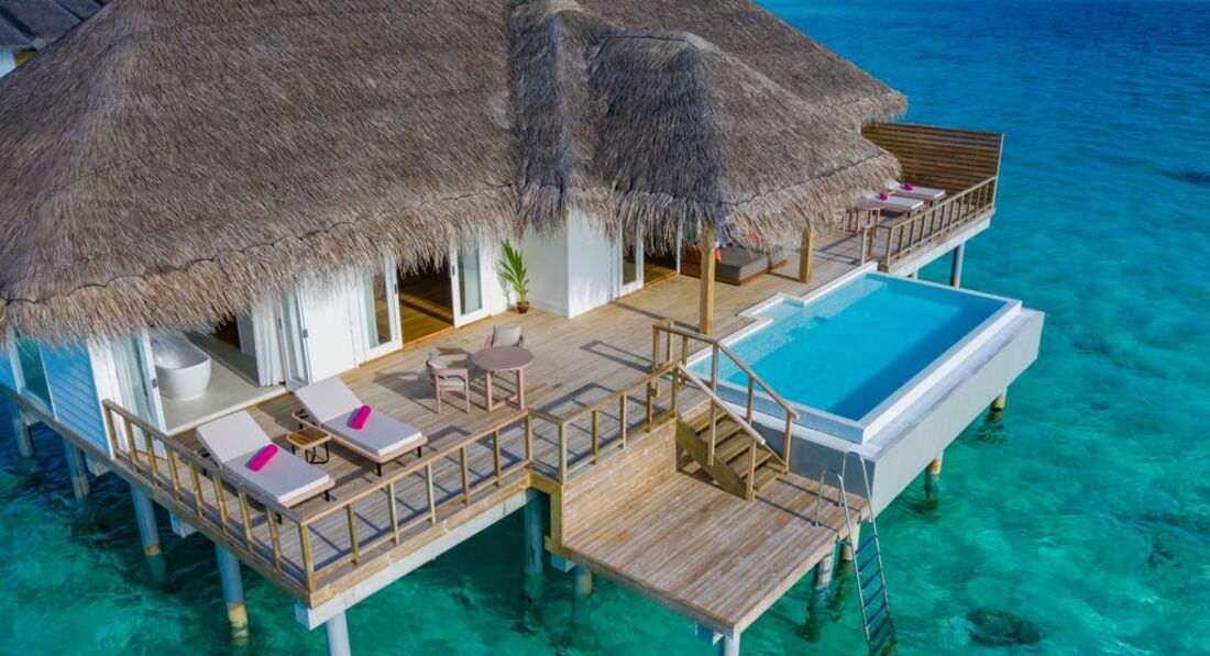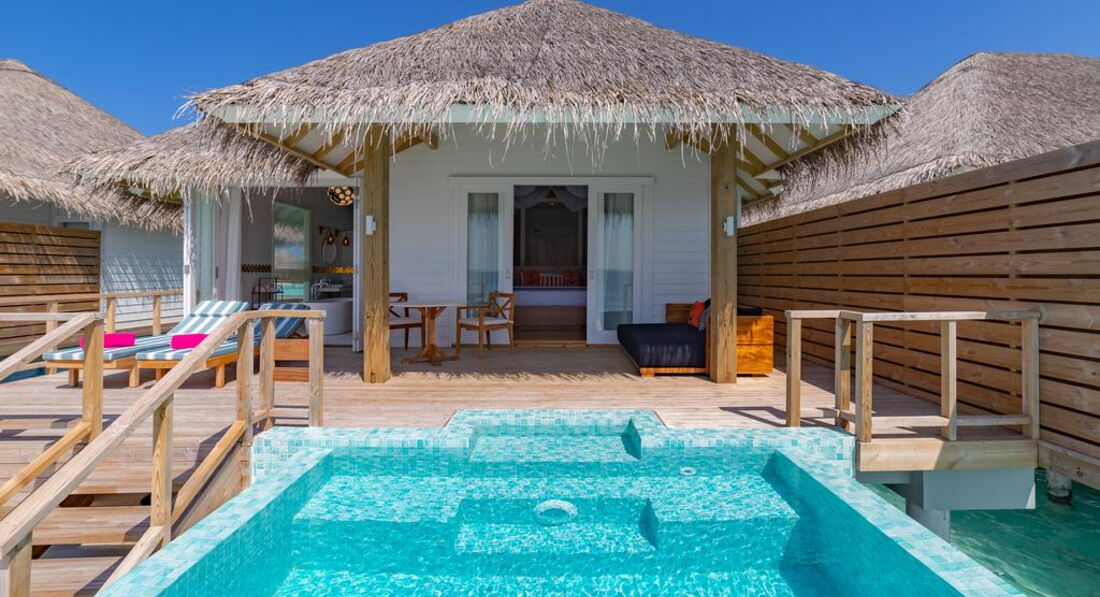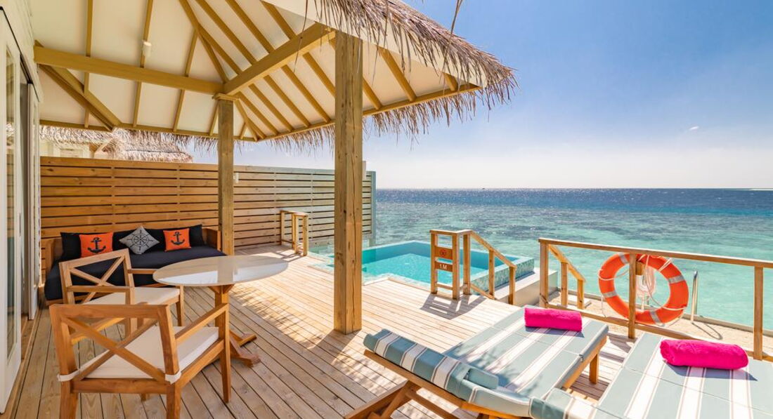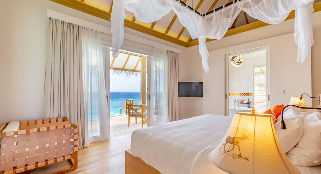 • 1 King Ocean Suite (393 м², макс. 6 або 4+2 особи). Водна вілла з двома спальнями, двома ванними кімнатами, терасою з приватним басейном та прямим спуском у воду