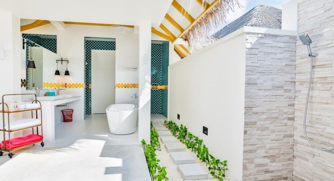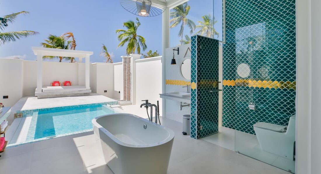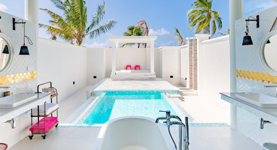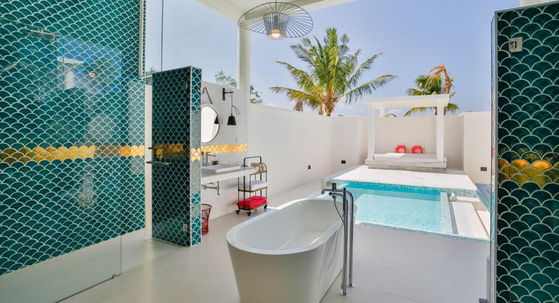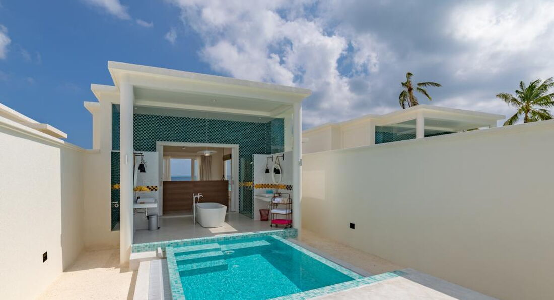 • 51 Beach Suite with Pool (93 м², макс. 3 або 2+2 особи). Берегові вілли. Спальня з ліжком king-size та зоною відпочинку, ванна кімната з ванною та душем, тераса з приватним басейном, внутрішній дворик