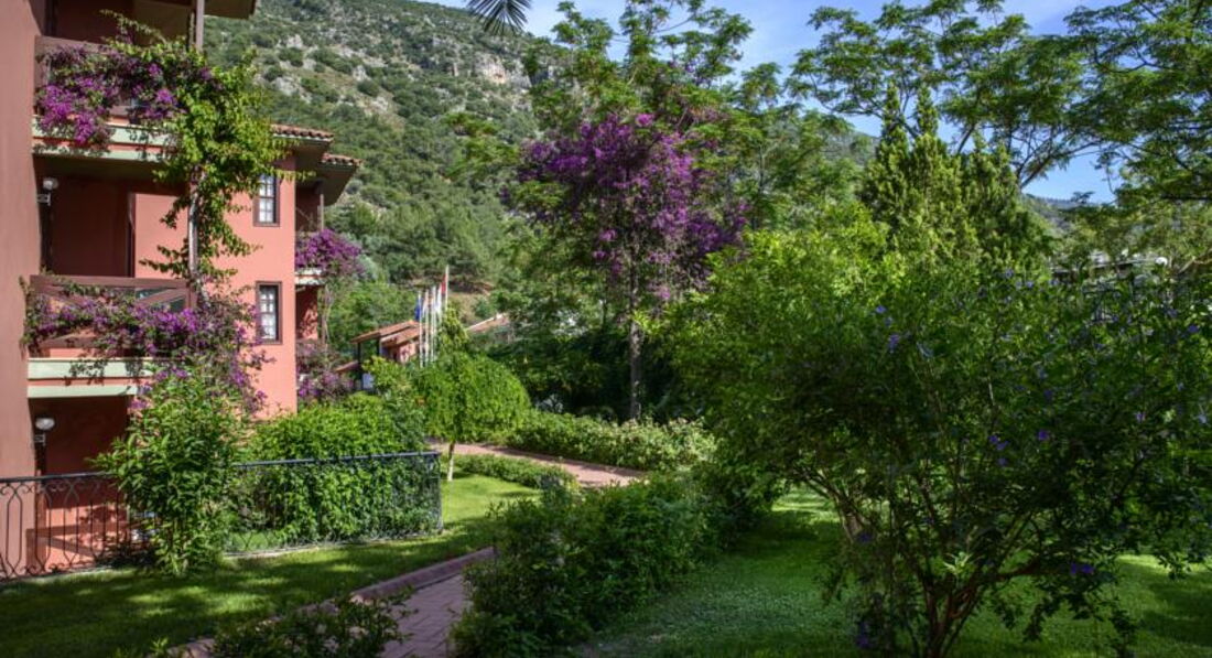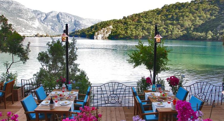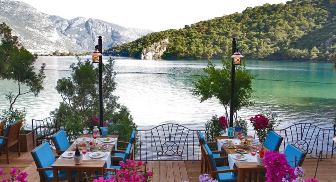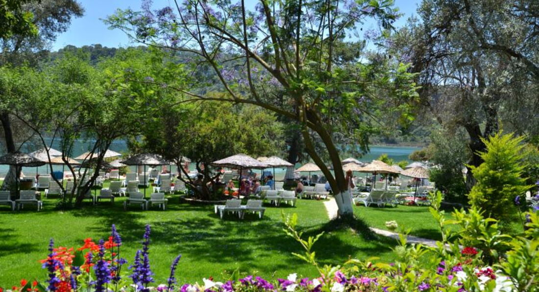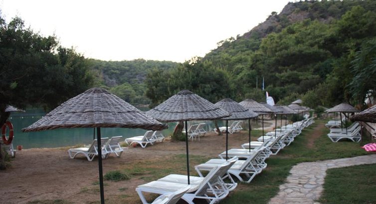 Это место близ поселка Олюдениз, как маленький оазис, окруженный горами. От аэропорта долго ехать, если еще останавливаться, собирать или развозить в другие отели туристов.