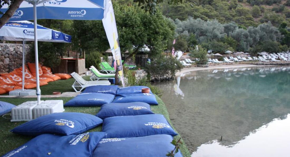 Собственный пляж находится в пяти минутах езды (курсирует бесплатное такси), в голубой лагуне. Там всегда тихо, спокойно, безветренно. С одной стороны-горы, с другой - чистейший пляж на песчаной косе (вход платный), расположенный в зоне заповедника. Жителям данного отеля можно бесплатно кататься на водном велосипеде. Пляжи оснащены туалетами и душевыми. На городском пляже платно шезлонги и матрасы, на собственном-шезлонги бесплатно.