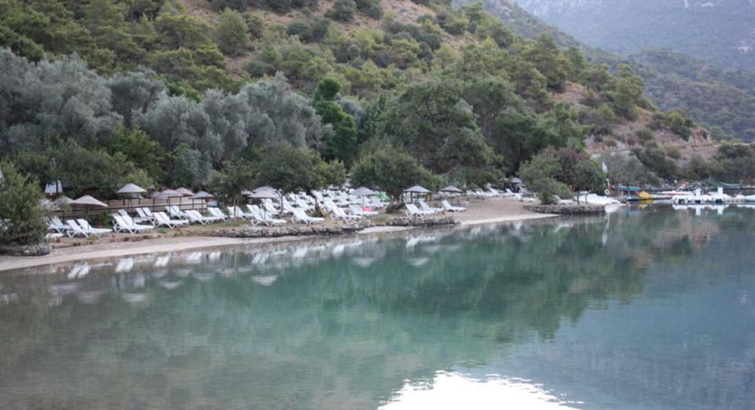 Первый - рядом с отелем (немного пройтись по улочке), общественный. Очень красивый мелкогалечный пляж в окружении высоченных гор. Восторг! Именно сюда приземляются парапланеристы, именно отсюда отходят местные маршрутки и именно здесь находятся прогулочные яхты. Можно взять напрокат зонтик или шезлонг - всё по 6 лир (=3$), а можно просто разместиться на своем полотенце, как большинство и делает))