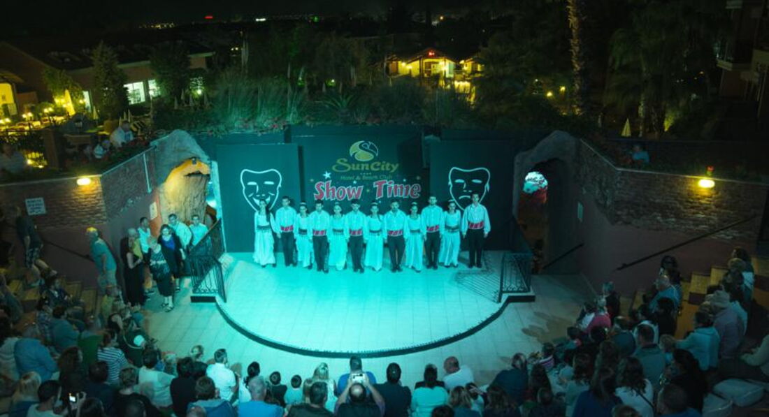 Очень понравился нам с мужем отель "Сан Сити"! Он расположен в отличном месте: вокруг горы, а до моря 5 мин хотьбы (городской галичный пляж). На свой пляж возят автобусами утром, а забирают в 17.30. Мы к обеду возвращались пешком, 30 мин хотьбы, созерцая красоту Голубой лагуны. Это неутомительно, мы активные, любим спорт. Кстати о спорте. Тренажерный зал есть, но там всего 3 тренажера. Но мой муж занимался. Больше никто (я иногда). С горы Баба-даг взлетают парапланеристы и парят над горами и морем. Каждый вечер в амфитеатре шоу-программа. Молодежь ходила еще на дискотеку и их куда-то возили. Экскурсии тоже можно различные заказать. В отеле 90% англичан. Они любят бассейн и бар у бассейна. Кормили отлично. Есть спа-салон, мне делали массаж. Вечерами там все гуляют по главной улице Олюдениза. И мы в том числе. Здесь бесчисленное кол-во кафе, баров, ресторанов, магазинов, салонов красоты и т.д. Все в огнях и турецких улыбках. Кто хочет спокойно и достойно отдохнуть - вам сюда!