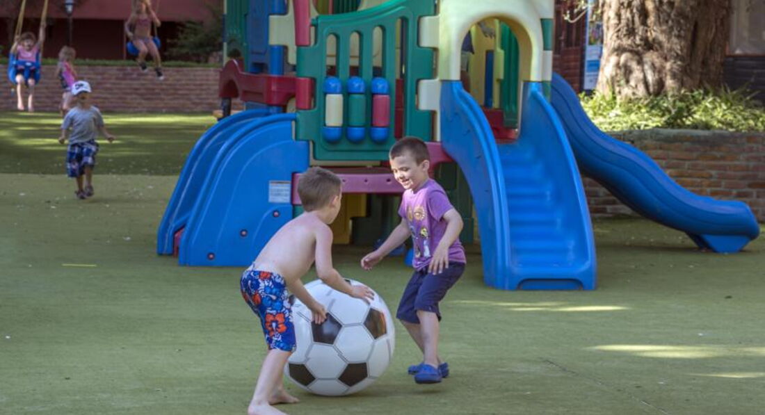 Территория отеля очень красивая, ухоженная, зеленая, много цветов и деревьев, но слишком маленькая, очень много народу, и маленьких детей. Детская площадка небольшая, одна на весь отель.